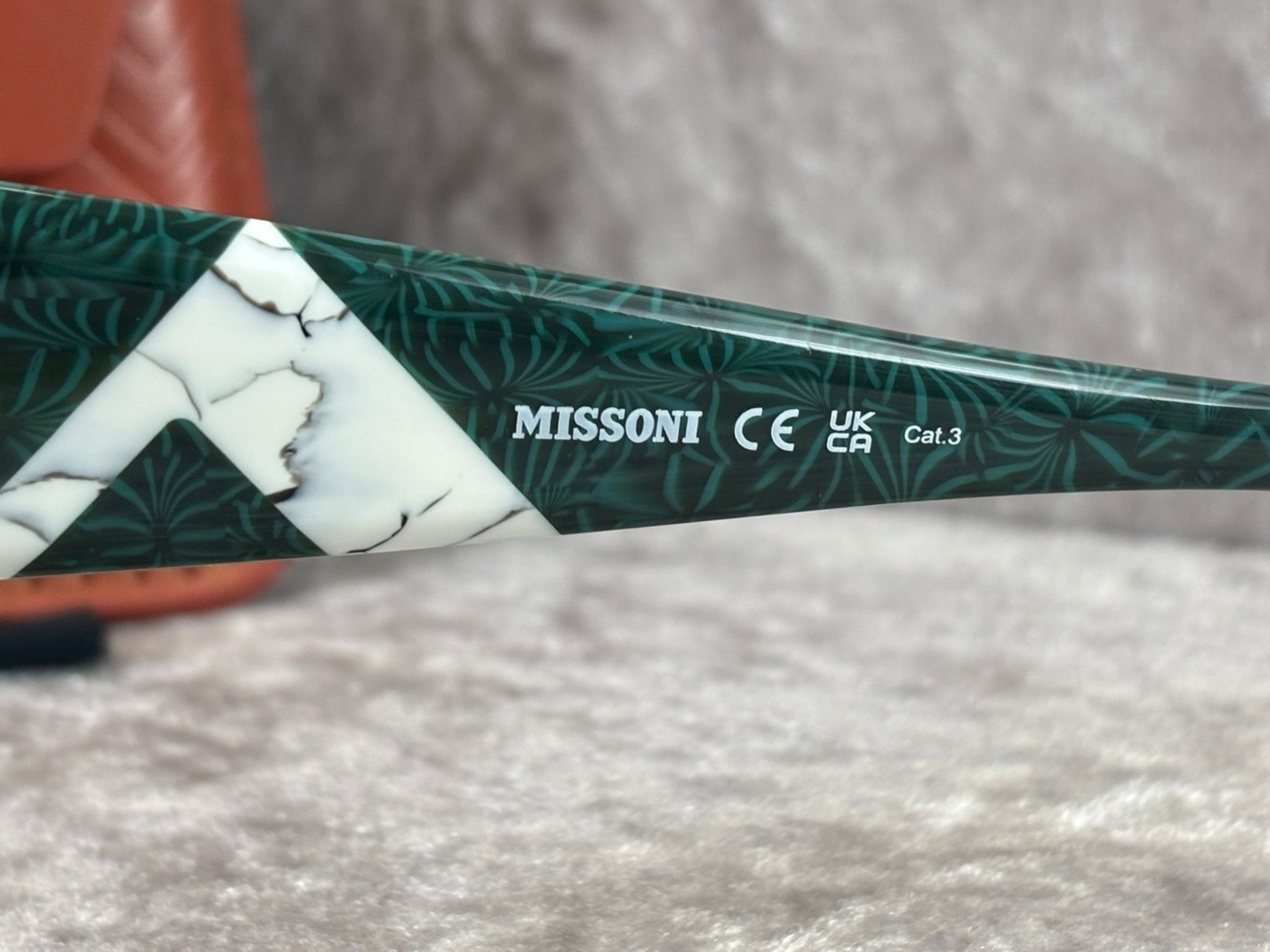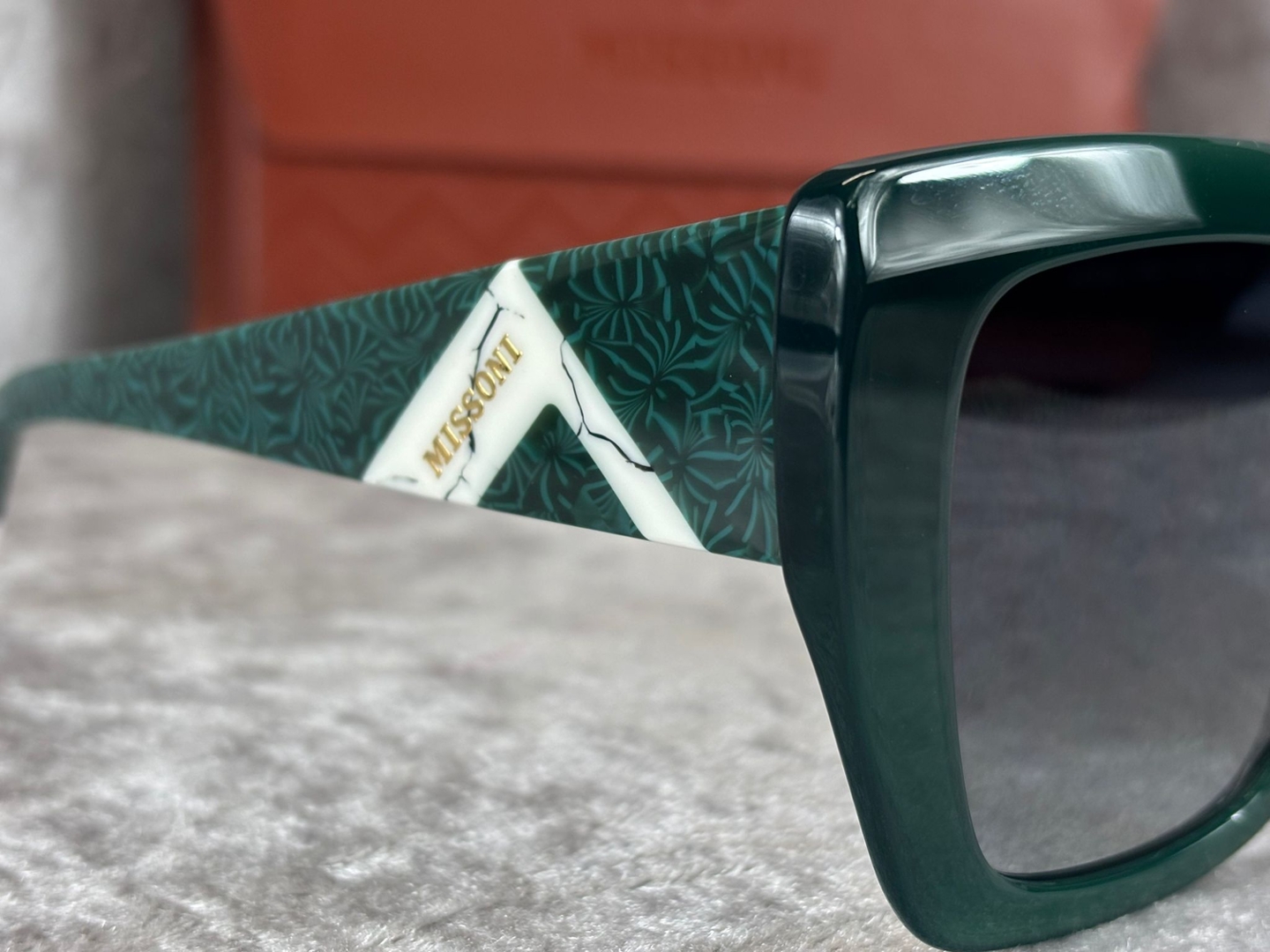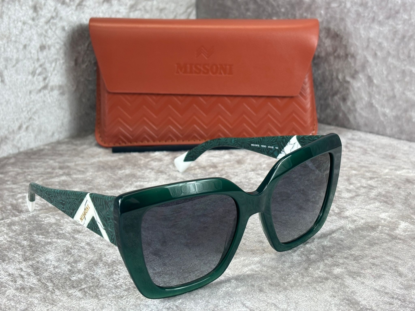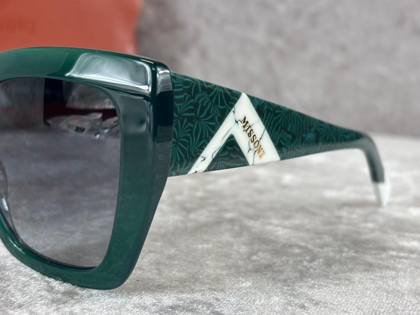 A Brand new and unused, these Missoni Square sunglasses showcase a bold, fashion-forward silhouette infused with the brand’s signature flair. The rich green square frame delivers a confident, structured look, beautifully complemented by softly tinted gradient lenses that add depth and sophistication. Designed to make a statement, this striking profile flatters a variety of face shapes while maintaining an elegant, contemporary edge.