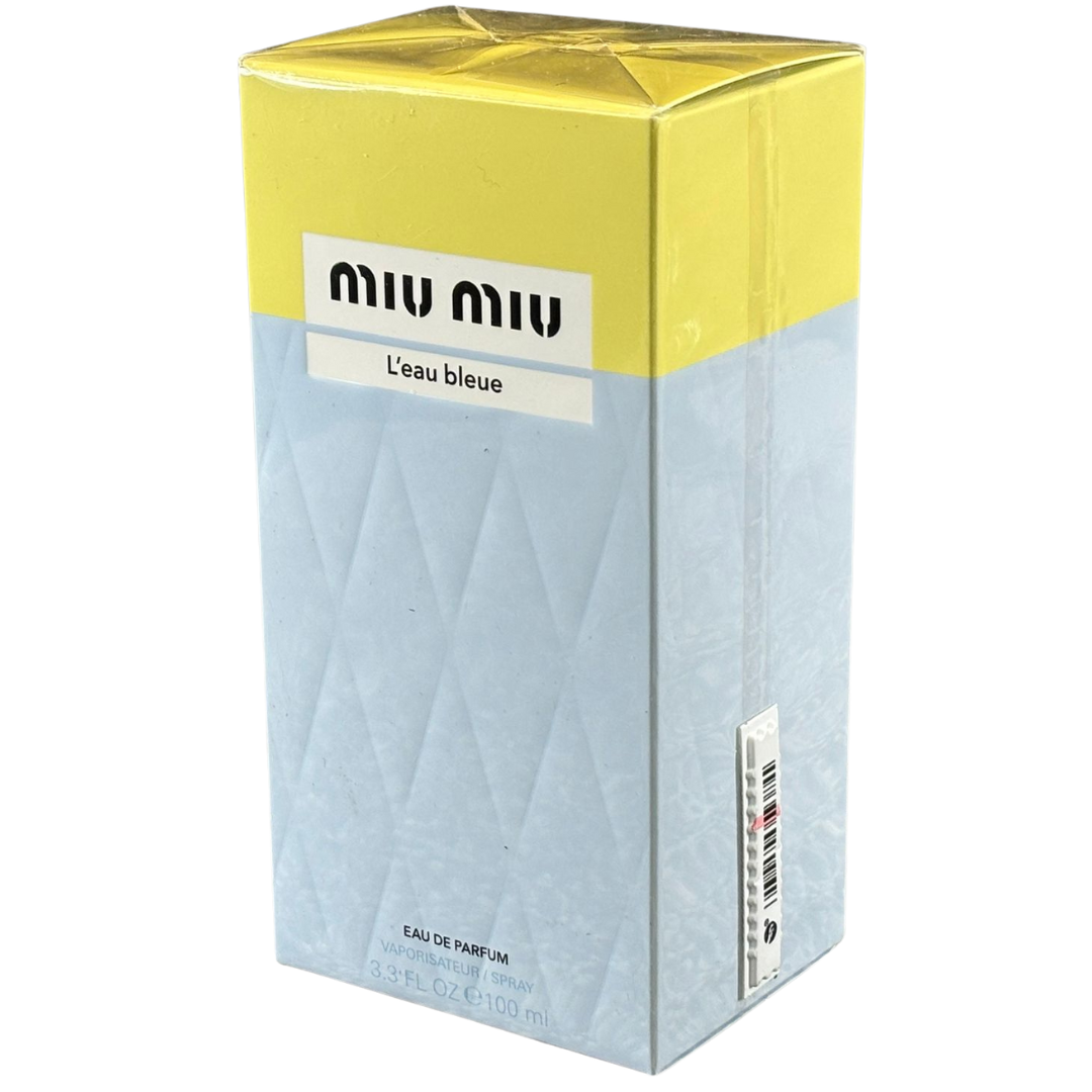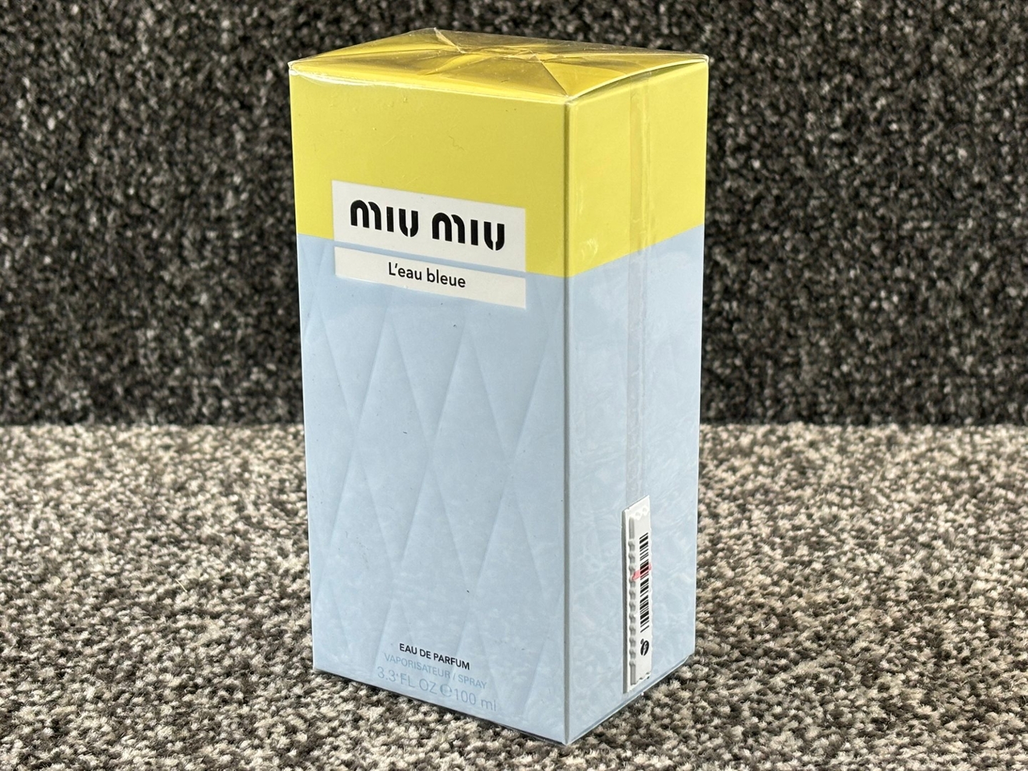 A 100ml bottle of Miu Miu L’Eau Bleue Eau De Parfum, presented in its original presentation box and offering a distinctive, contemporary fragrance from the Miu Miu collection. This refined scent reflects the brand’s modern, fashion-forward identity, blending elegance with a confident and unconventional edge.