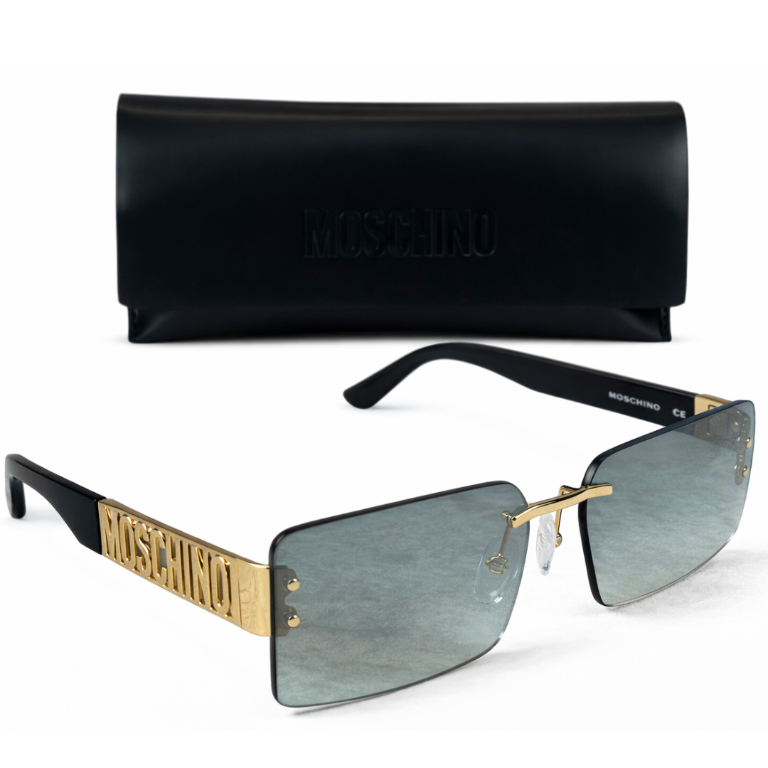 The standout detail lies in the gold MOSCHINO lettering integrated along the arms, giving the sunglasses an instantly recognisable luxury edge. The rimless construction keeps the look modern and lightweight, while the structured rectangular shape adds a confident, fashion-forward finish. Designed to turn heads, this pair perfectly balances minimal lens styling with bold branding.