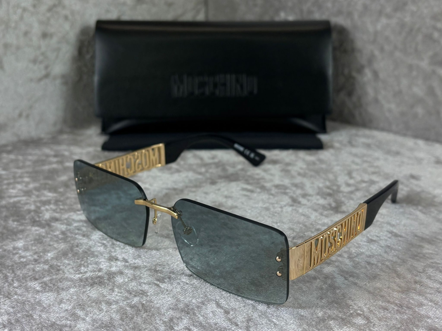 A Brand new, unused pair of Moschino Rectangular - Teal Gold Sunglasses.