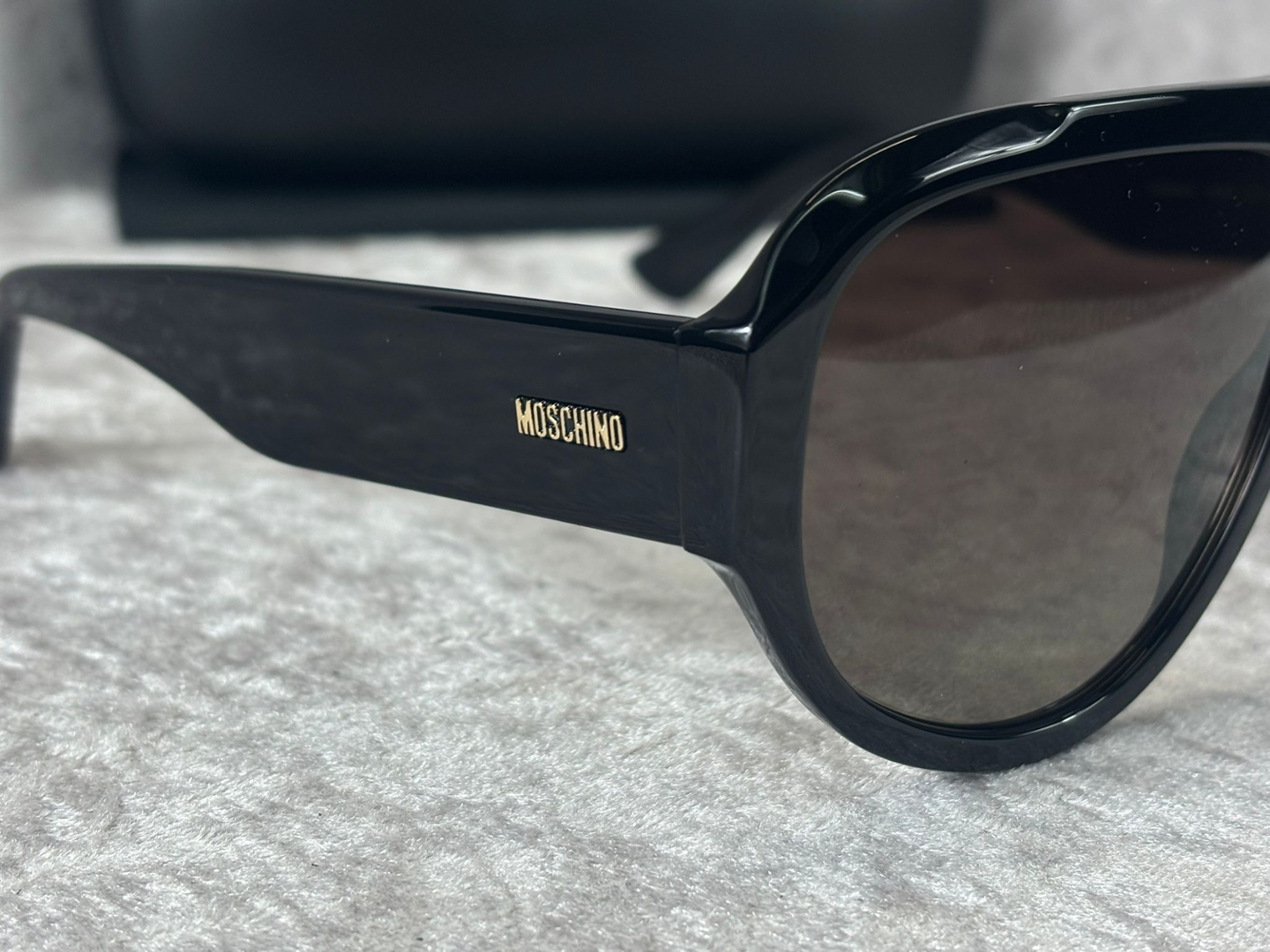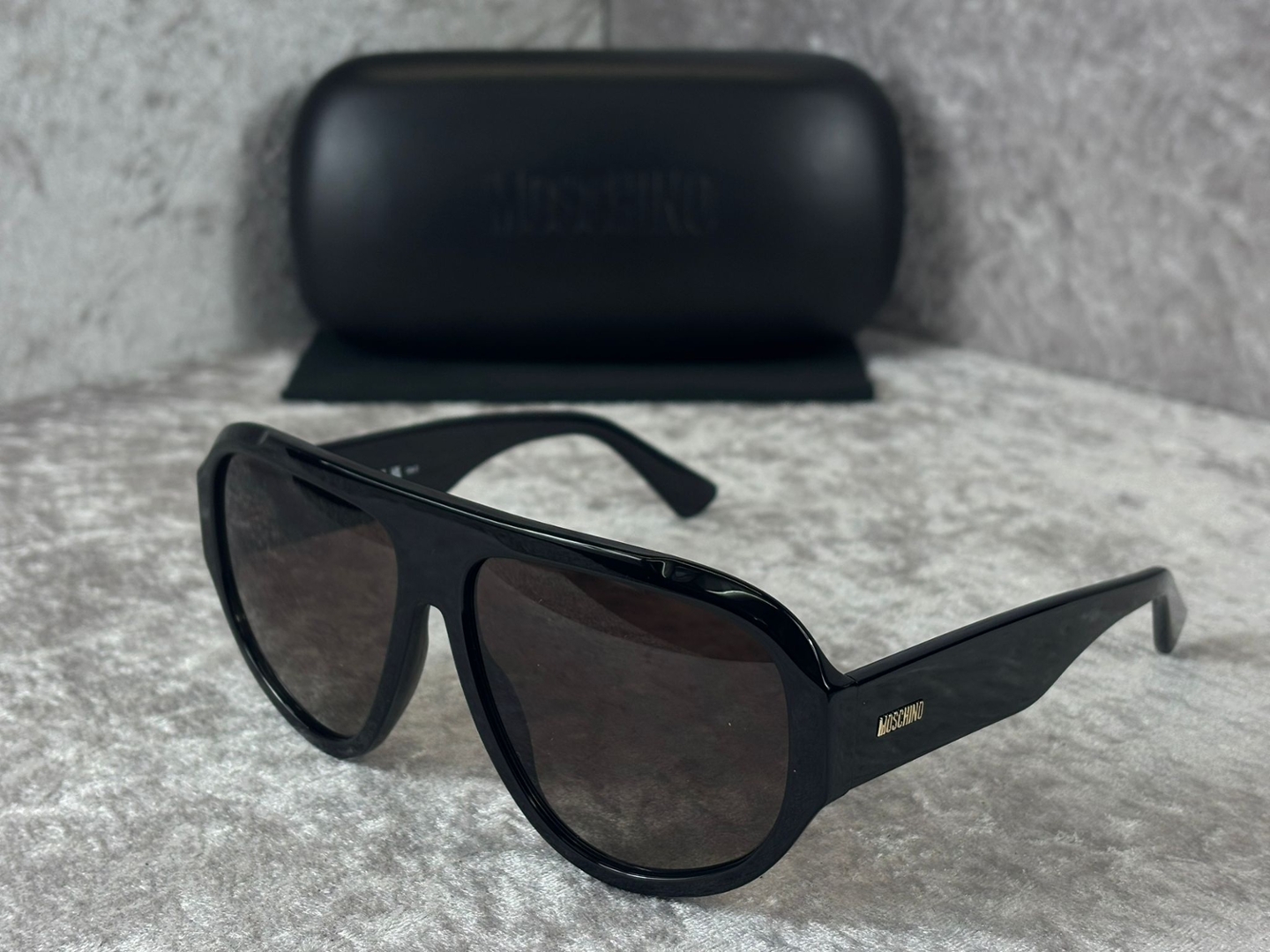 The smooth acetate front contrasts subtly with the textured temples, adding depth and character to the design. Discreet Moschino branding at the sides reinforces the designer identity without detracting from the clean, powerful lines. The flat-top construction offers a distinctive look that stands apart from traditional square frames, giving these sunglasses a fashion-forward edge.