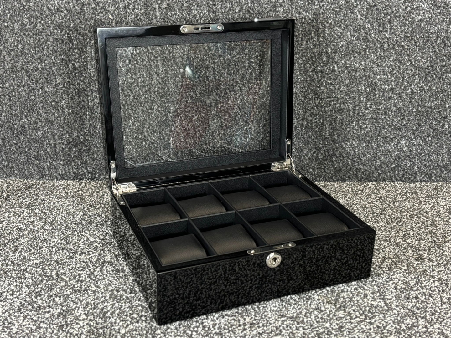 A Motion 8 Compartment Black Wooden Piano Finish Watch Box, designed to present and protect a curated watch collection with understated elegance. The exterior features a deep black piano finish with a clear glass display lid, allowing the contents to be admired at a glance while remaining securely housed. Clean lines and a compact profile give the piece a refined, modern presence suitable for both contemporary and classic interiors.