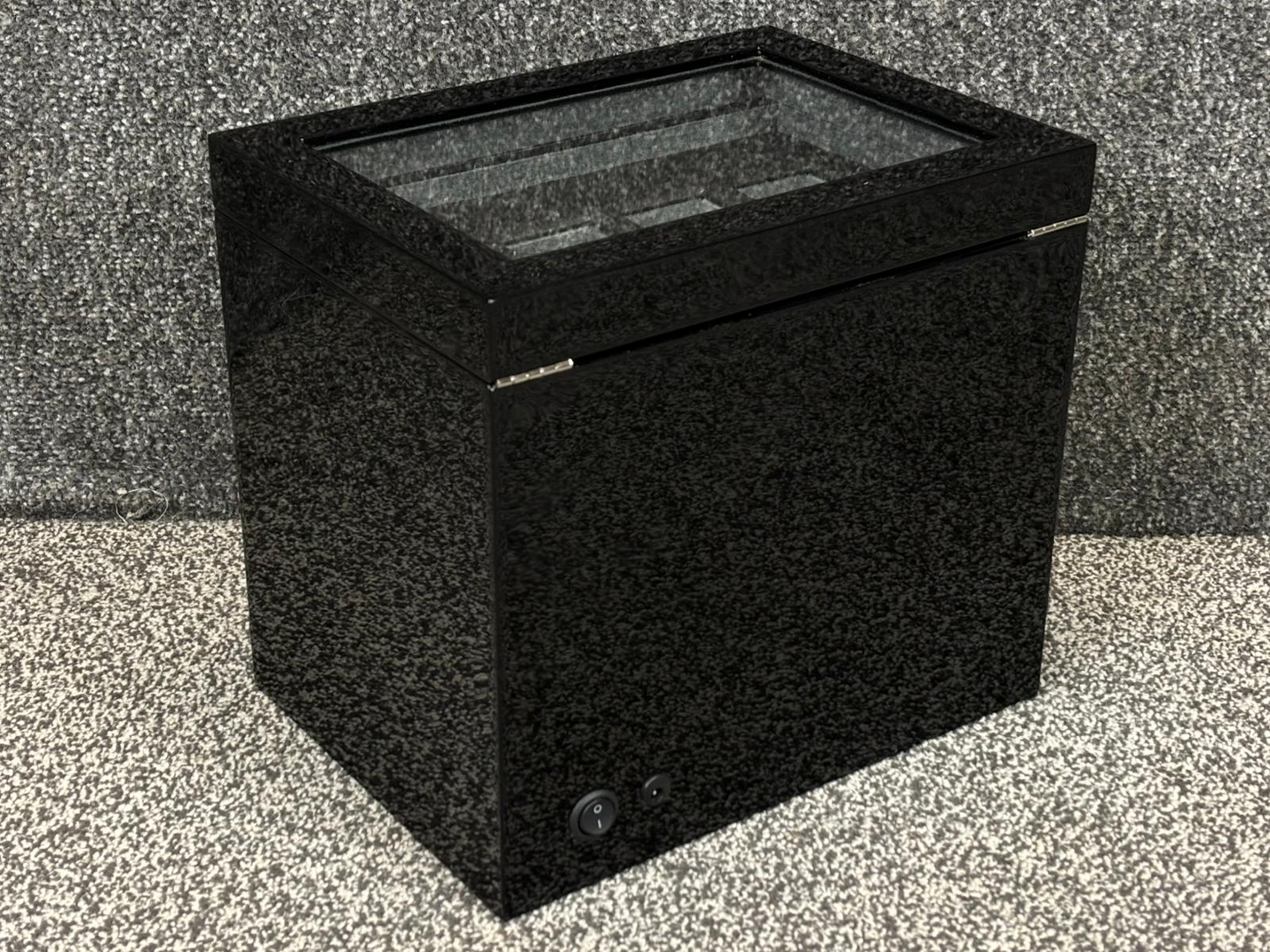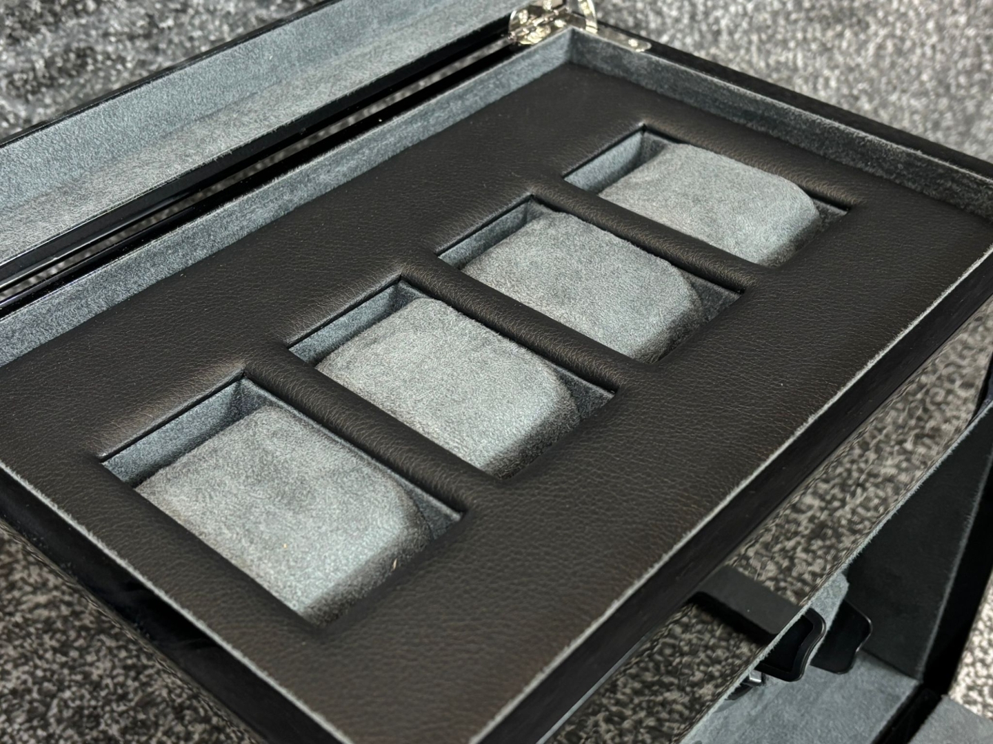 Opening the lid reveals a soft grey suede interior, providing a gentle and protective environment for your watches. With dimensions of approximately 27cm in height, 30cm in width, and 22cm in depth, it offers ample space while maintaining a compact footprint.