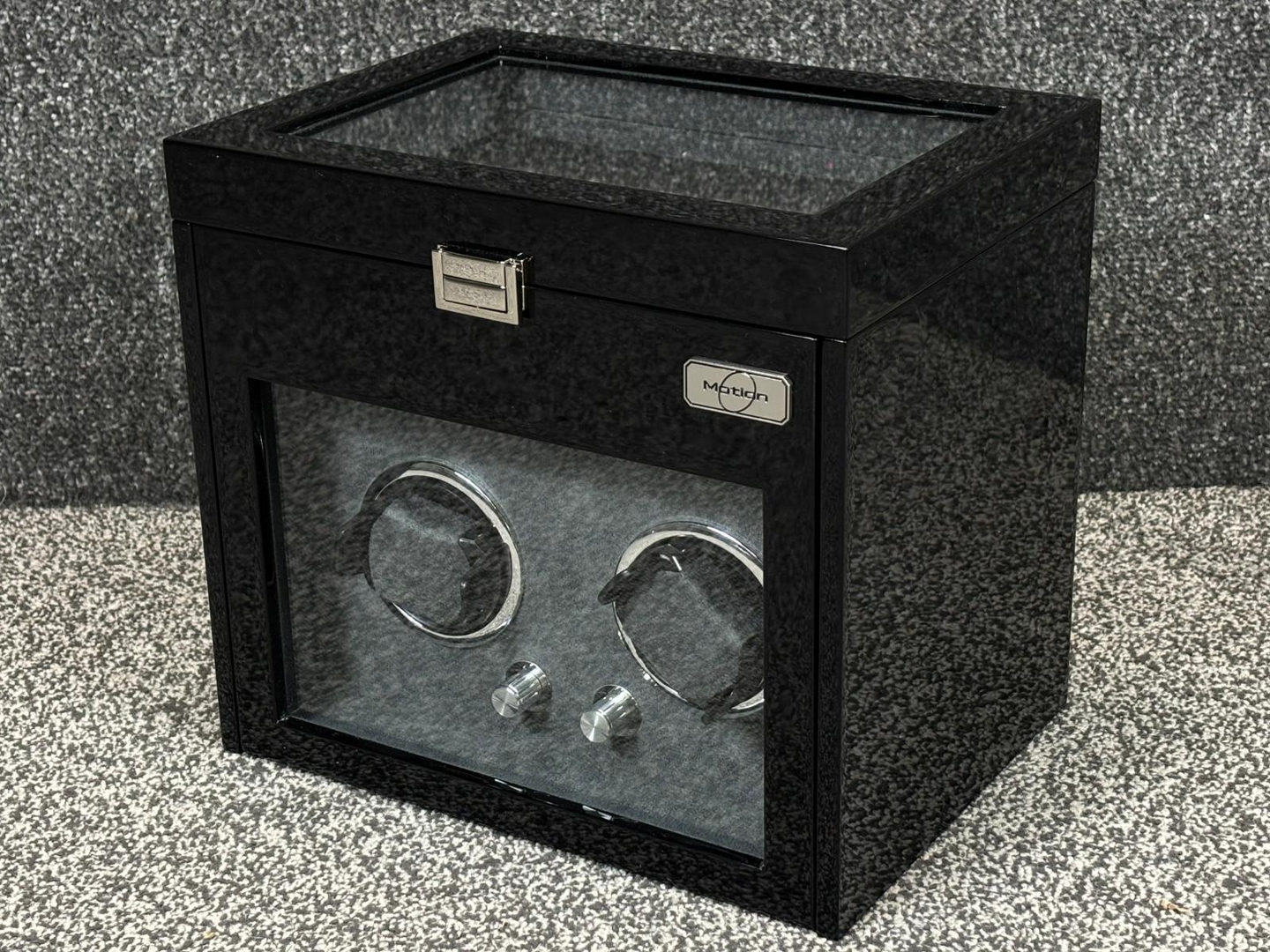 A Motion Double Black Wooden Piano Finish Watch Winder, comprising a four watch storage compartment at the top & with a black leather & grey suede interior. Approx 27cm height, 30cm width, 22cm depth.