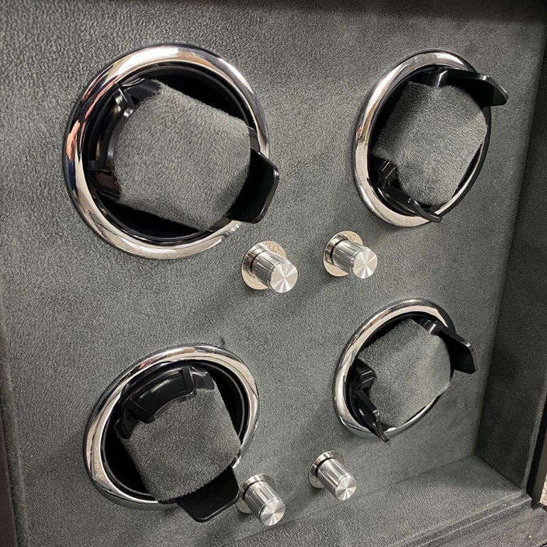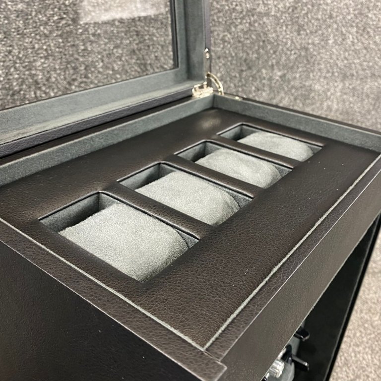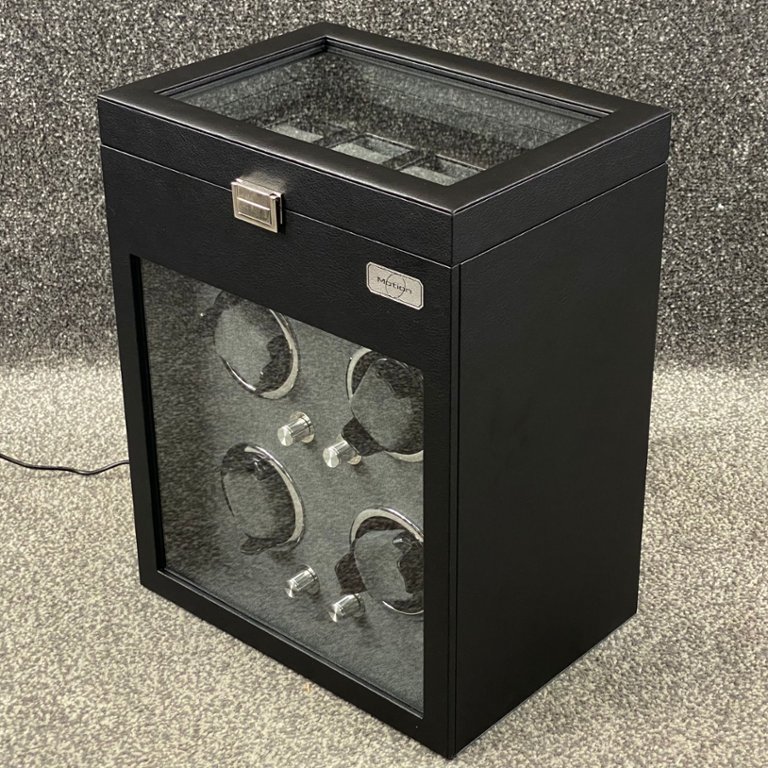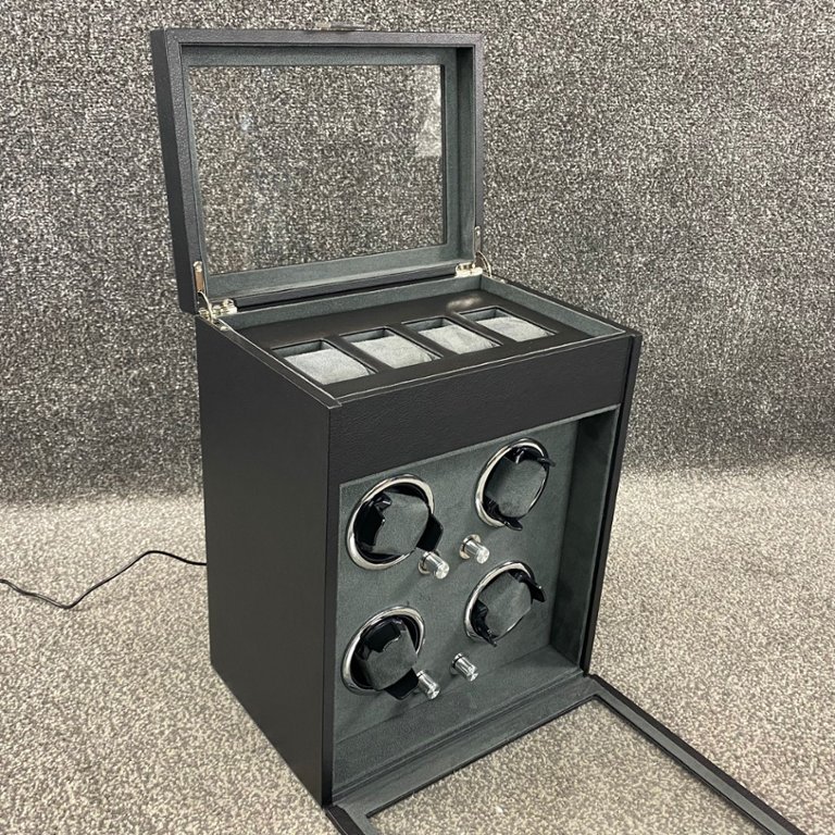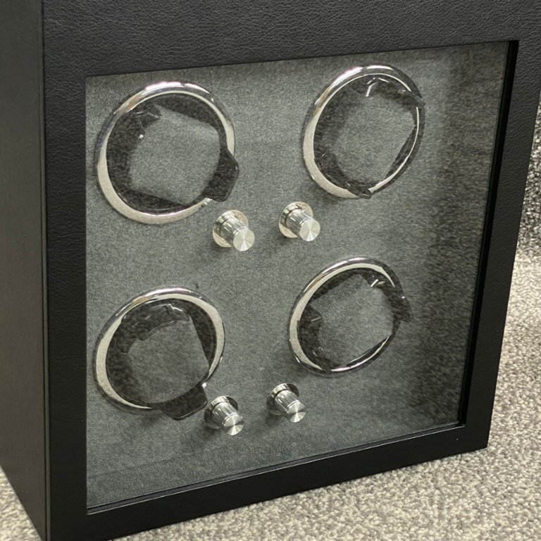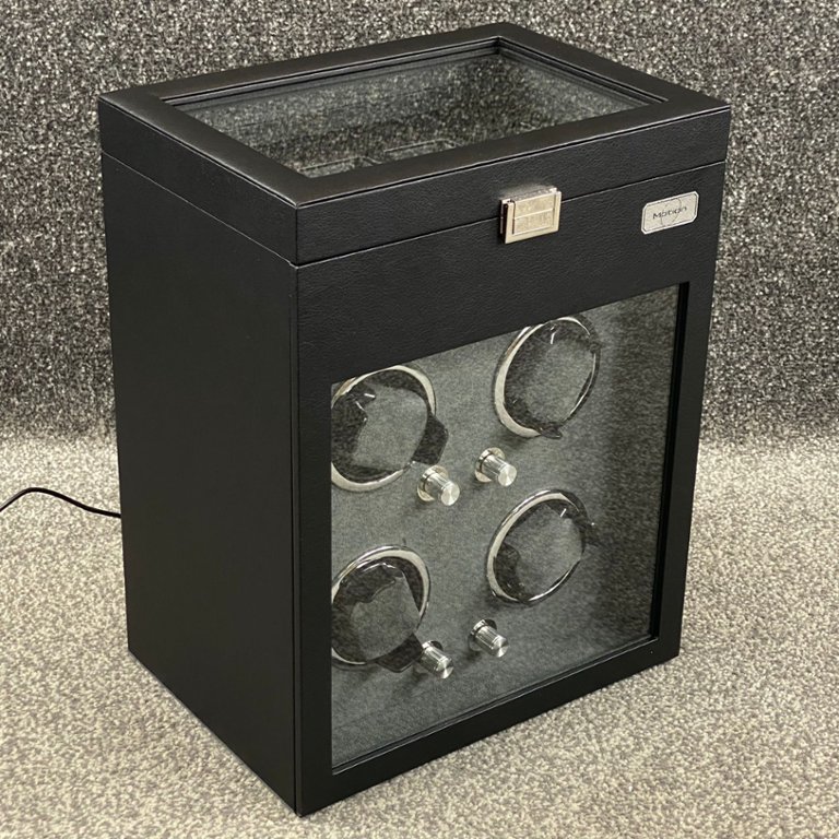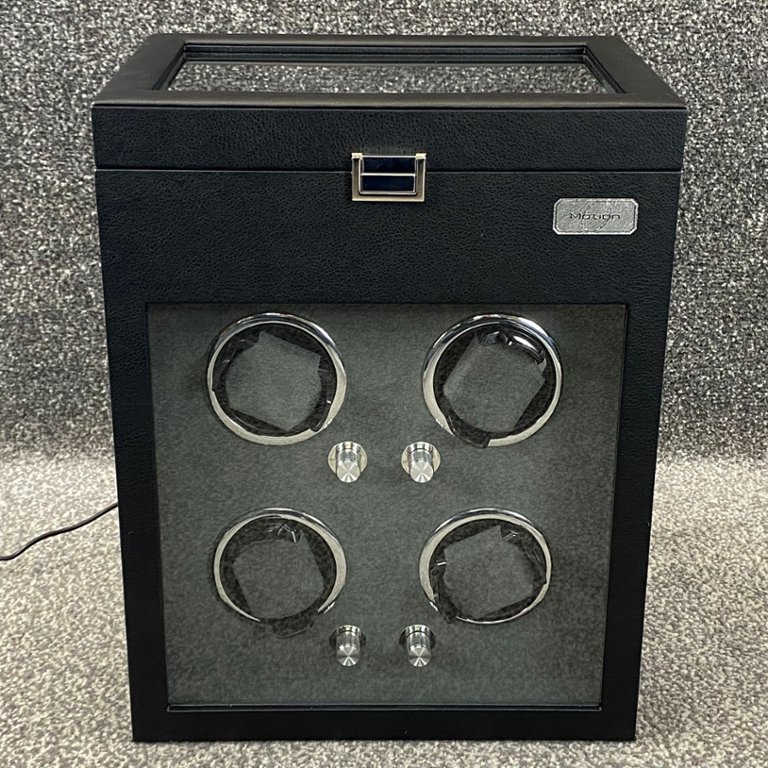 A Motion Quad Black Leather Watch Winder, a luxurious accessory for the discerning watch enthusiast. Crafted with sophistication and functionality in mind, this winder boasts a sleek black leather exterior that exudes elegance. The winder features a spacious four-watch storage compartment on the top, allowing you to showcase and safeguard your prized timepieces with ease.