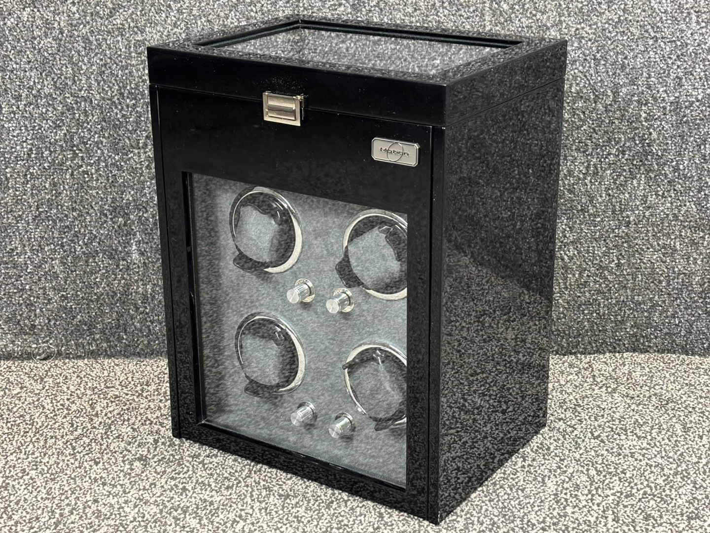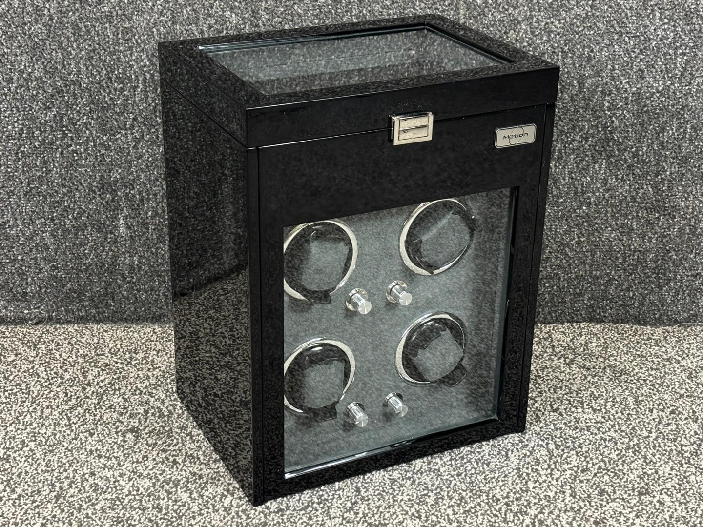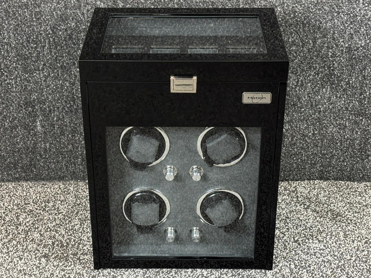 A Motion Quad Black Wooden Piano Finish Watch Winder, comprising a four watch storage compartment on top & with a black leather & grey suede interior. Approx 38cm height, 30cm width, 22cm depth.