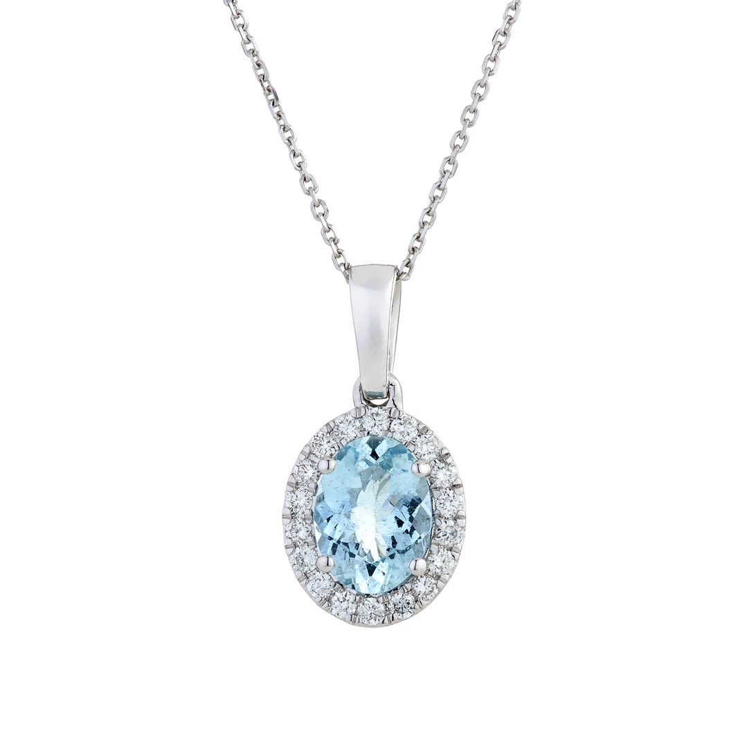 A brand-new, unused, certified natural diamond & aquamarine oval-shaped cluster pendant, with one oval mixed-cut aquamarine gemstone at the centre & a cluster of brilliant-cut diamonds in a halo setting, in 9ct white gold.