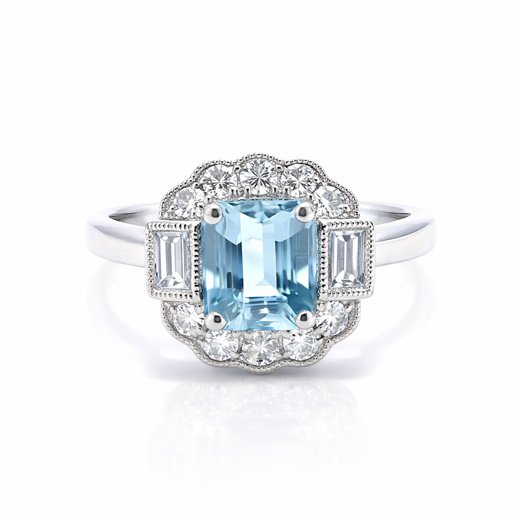 Framing the centre stone is a graceful halo of ten brilliant-cut natural diamonds, arranged to form the ring's delicate floral silhouette. Two baguette-cut diamonds are positioned on either side of the aquamarine, introducing a refined architectural balance that complements the cluster's symmetry. With a combined diamond weight of 0.44 carats, the natural diamonds provide lively brilliance and contrast beautifully against the cool tones of both the aquamarine and the platinum setting.