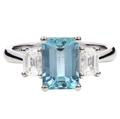 The side diamonds contribute to a total diamond weight of 0.60ct, offering bright, mirror-like flashes of light that complement the aquamarine’s cool clarity. The clean lines of the emerald cuts introduce refinement and structure, while the platinum setting enhances the overall brightness with its naturally white tone and exceptional durability. The three-stone arrangement carries timeless symbolism, representing past, present and future within a design that feels both contemporary and enduring.