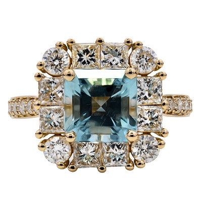 A brand-new, unused, certified natural diamond & aquamarine cluster ring, with one Asscher-cut aquamarine gemstone at the centre, a cluster of princess-cut & brilliant-cut diamonds in a halo setting & a cluster of brilliant-cut diamonds on the shoulders, set in 18ct yellow gold.