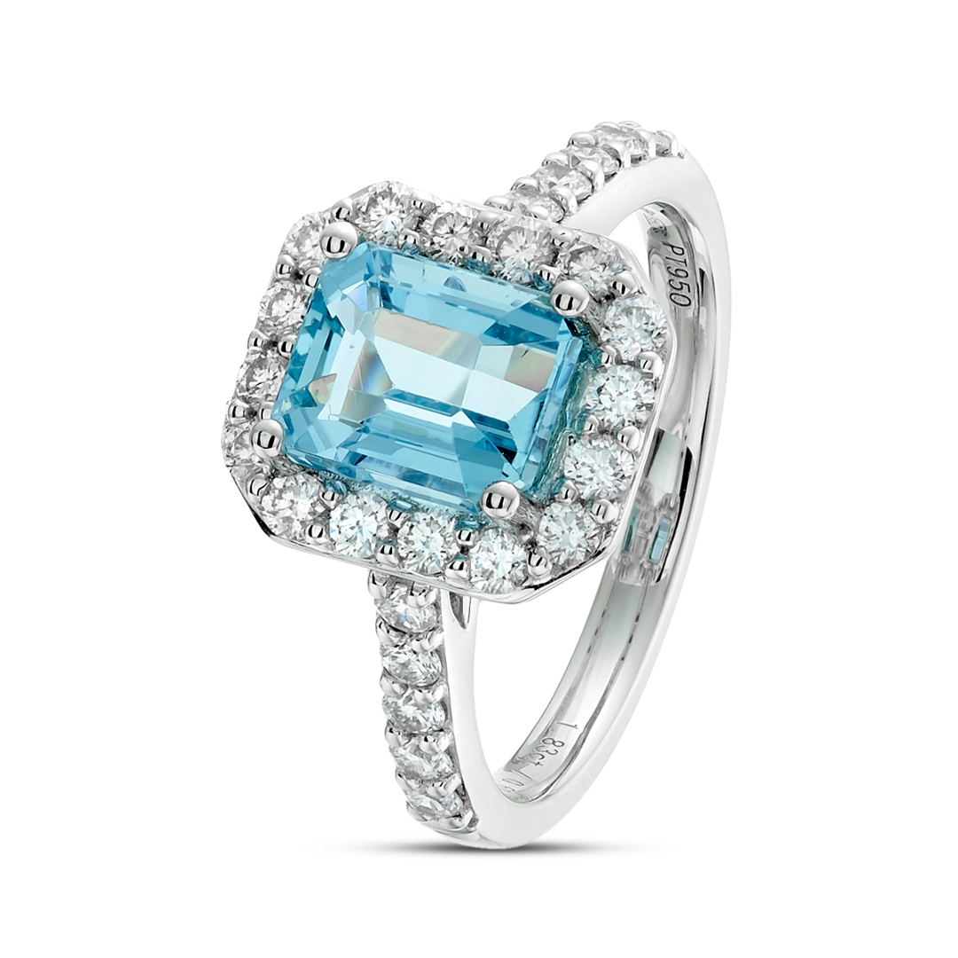 A brand-new, unused, certified natural diamond & aquamarine asscher-shaped cluster ring, with one octagonal step-cut aquamarine gemstone to the centre & a cluster of brilliant-cut diamonds in a halo setting & to the shoulders, set in platinum.