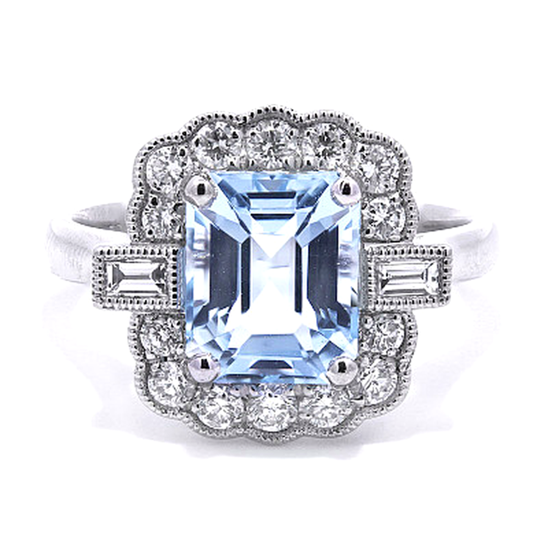Flanking the centre gemstone are two baguette-cut natural diamonds, adding structure and elegance to the overall composition. Surrounding the aquamarine is a halo of brilliant-cut diamonds, with additional brilliant-cut diamonds extending along the shoulders to enhance the ring’s sparkle and visual depth. These diamonds have a combined total weight of 0.43ct, producing lively flashes of light that beautifully complement the aquamarine's calm blue tone. Natural diamonds are widely admired for their rarity, durability and enduring prestige within the world of fine jewellery.