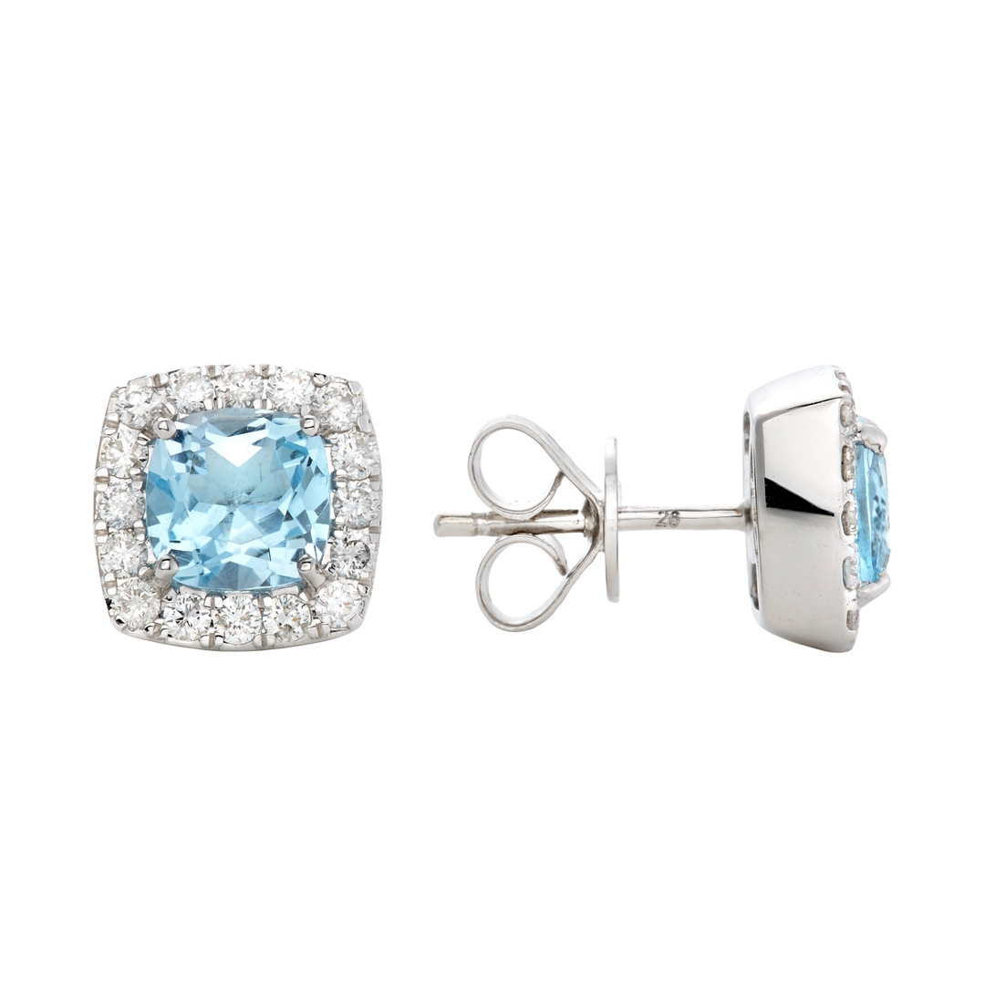 A brand-new, unused and certified pair of natural diamond and aquamarine cluster earrings, crafted in a cushion-shaped design, each set with a central aquamarine and framed by a halo of brilliant-cut natural diamonds. The soft, pale blue tone of the aquamarine is enhanced by the crisp finish of the 18ct white gold setting, creating a fresh, balanced aesthetic suited to both everyday wear and more formal occasions.