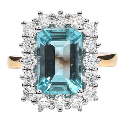 A brand-new, unused, certified natural diamond & aquamarine cluster ring, with one emerald-cut aquamarine gemstone at the centre & a cluster of brilliant-cut diamonds in a halo setting, set in platinum & 18ct yellow gold.