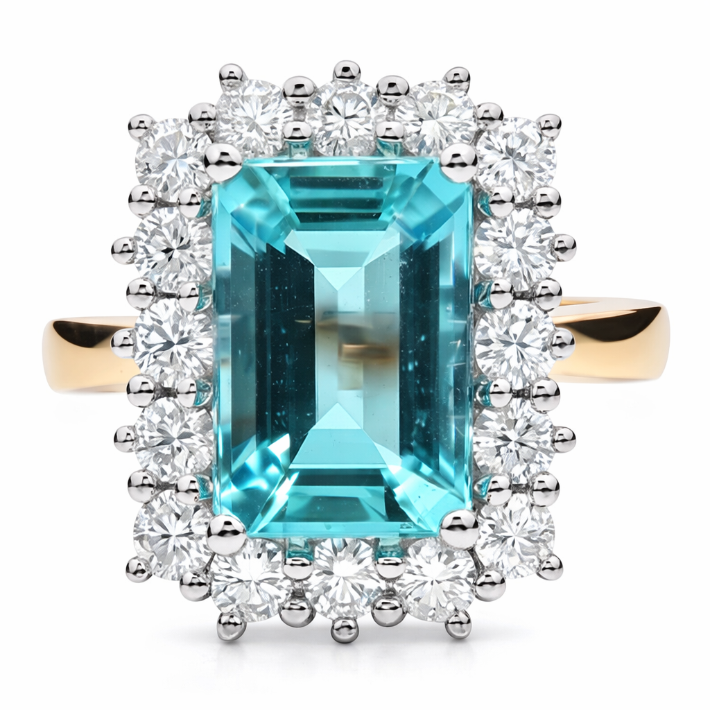 A brand-new, unused, certified natural diamond and aquamarine cluster ring, crafted in a refined combination of platinum and 18ct yellow gold, offering both visual distinction and enduring value. At the centre sits a striking emerald-cut aquamarine weighing 3.05 carats, chosen for its crisp step-cut facets and elegant pale blue tone. Surrounding the centre stone is a halo of brilliant-cut natural diamonds, totalling 0.89 carats, carefully arranged to enhance light performance and provide contrast against the clean geometry of the aquamarine. The interplay of platinum and yellow gold adds depth and warmth while reinforcing the ring’s fine jewellery credentials.