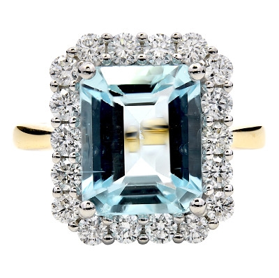 A brand-new, unused, certified natural diamond & aquamarine gemstone cluster ring, set with one emerald-cut aquamarine gemstone at the centre & a cluster of brilliant-cut diamonds in a halo setting, set in platinum & 18ct yellow gold.