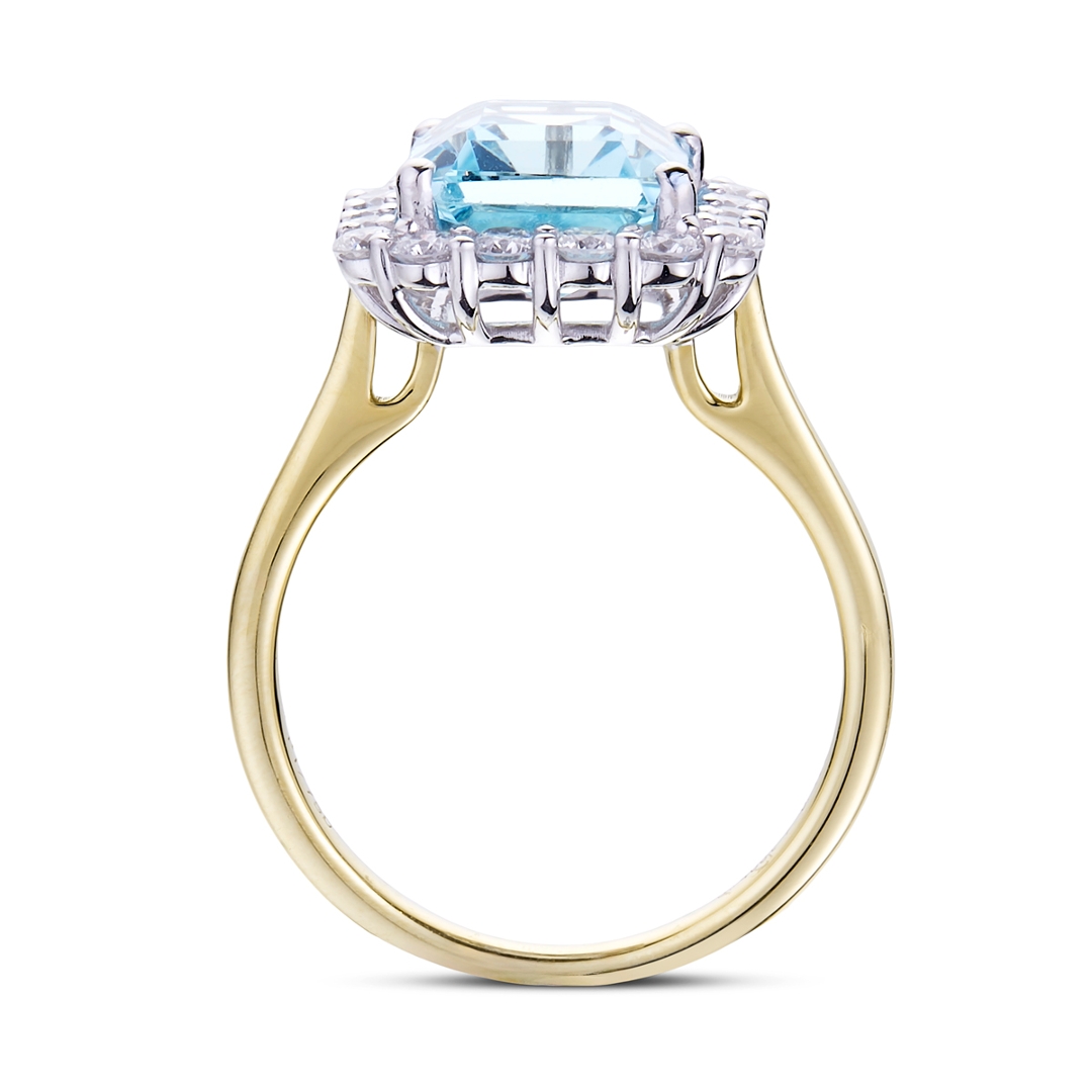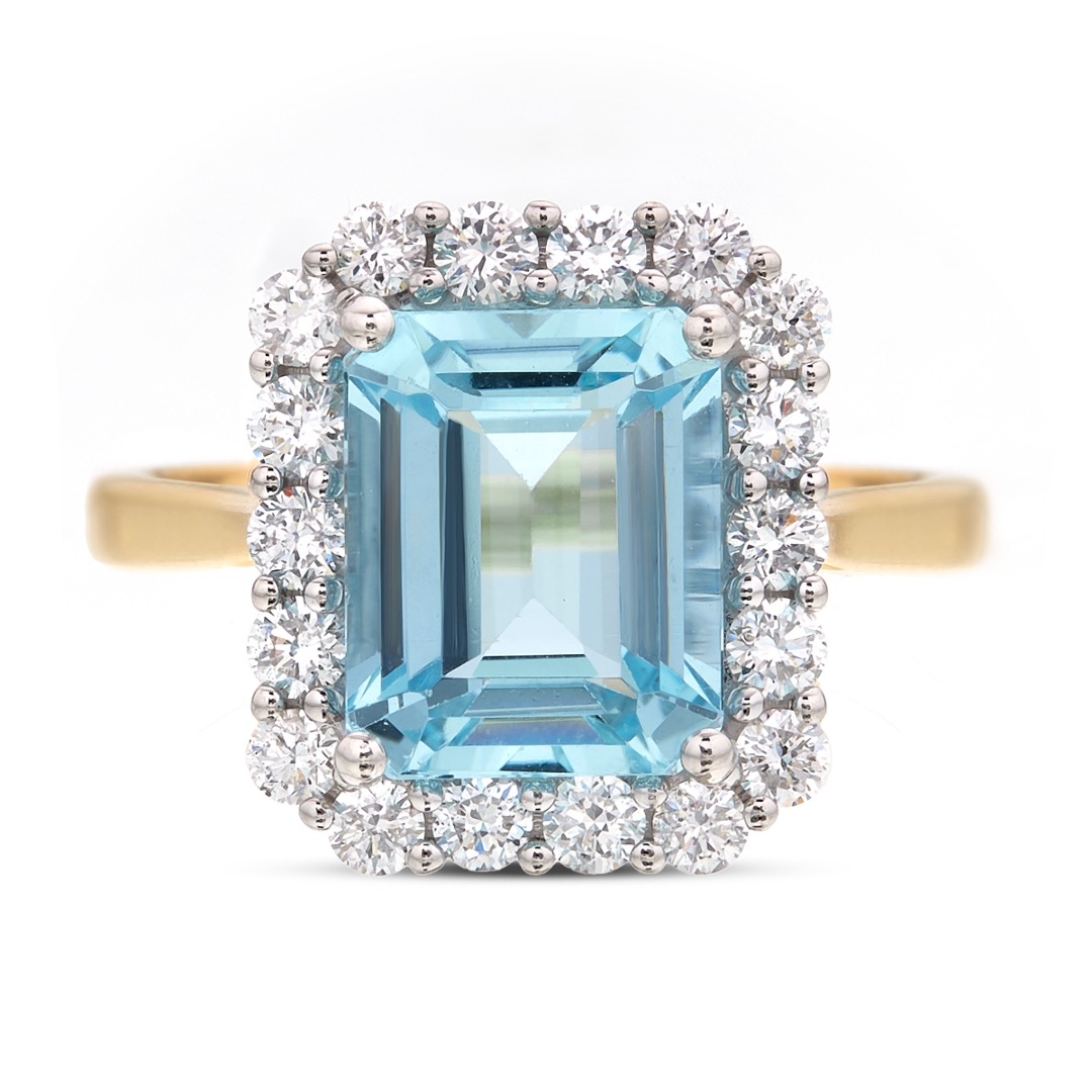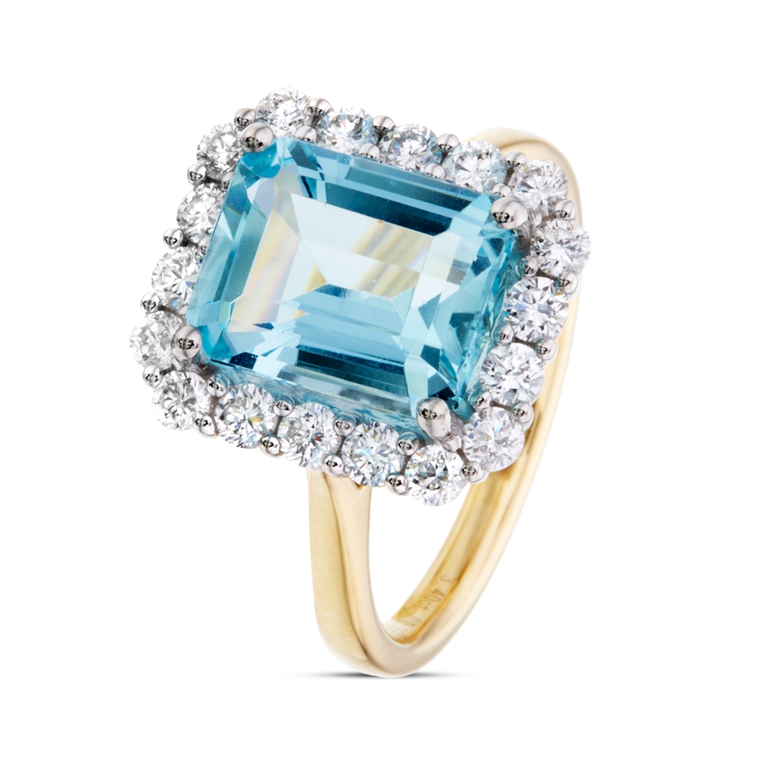 A brand-new, unused, certified natural diamond & aquamarine gemstone cluster ring, set with one emerald-cut aquamarine gemstone at the centre & a cluster of brilliant-cut diamonds in a halo setting, set in platinum & 18ct yellow gold.