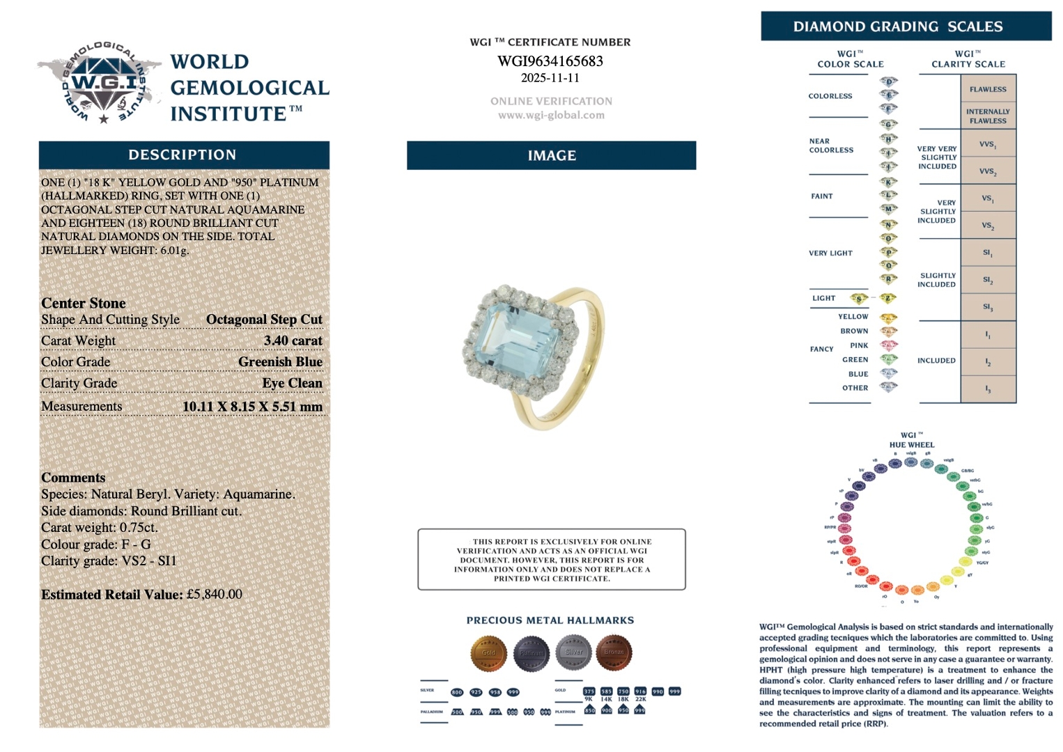 A brand-new, unused certified natural diamond and aquamarine cluster ring that blends cool colour, refined sparkle and a beautifully structured design. At its centre, a 3.40ct emerald-cut aquamarine displays a serene greenish-blue tone with crisp clarity, offering a fresh, elegant presence that shifts gently with the light. The emerald cut enhances the stone’s clean geometry, allowing long, glassy flashes to move across the surface and giving the ring a sophisticated, contemporary profile. Surrounding the aquamarine is a halo of natural brilliant-cut diamonds totalling 0.75ct in F–G colour and VS2–SI1 clarity, creating a bright, lively frame that intensifies the gemstone’s cool hue while adding a luxurious degree of sparkle.