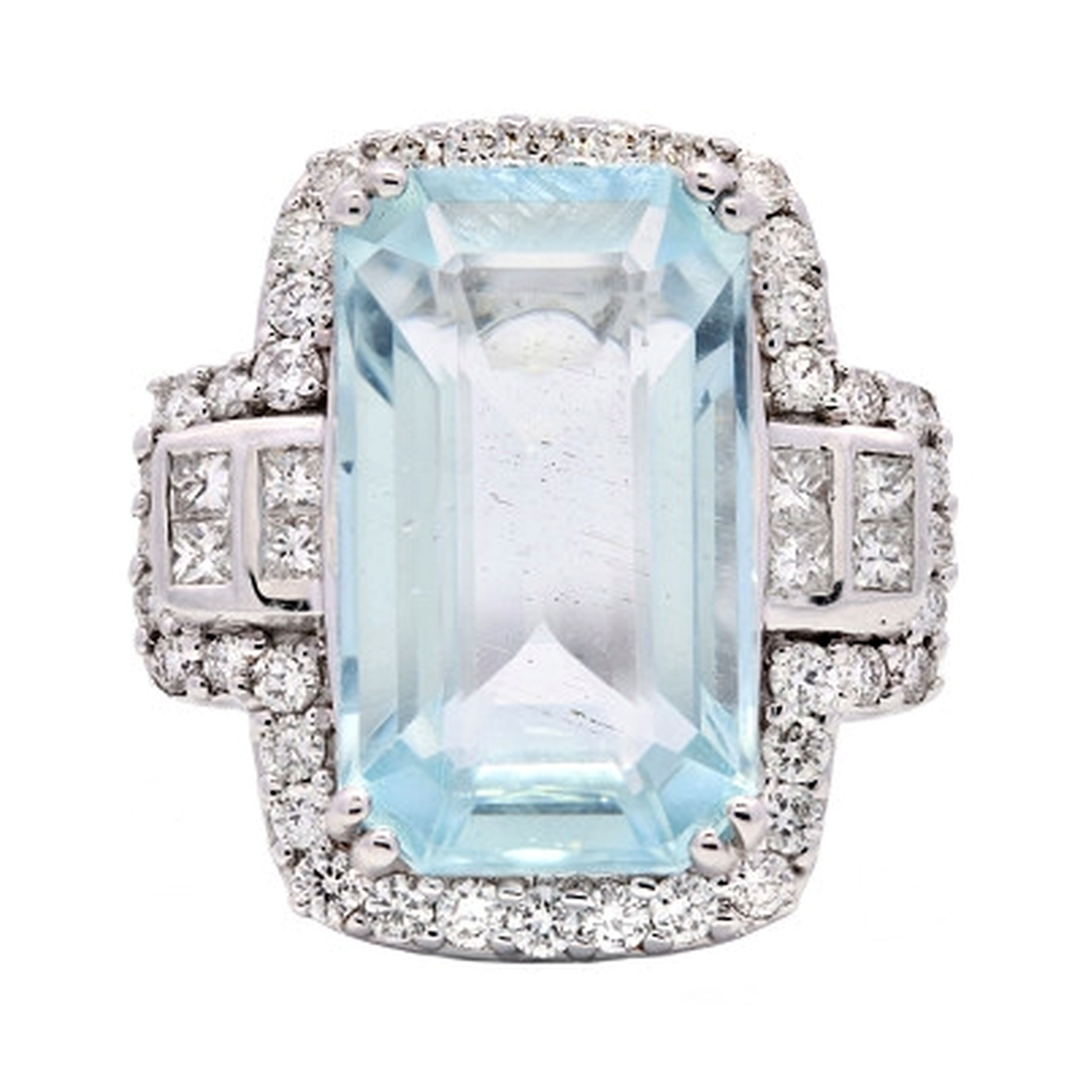 A brand-new, unused certified natural diamond and aquamarine cluster ring, finely crafted in platinum and centred around an impressive emerald-cut aquamarine weighing 6.04ct. The gemstone displays the cool, tranquil blue tone for which aquamarine is widely admired, with the elegant step-cut facets highlighting its clarity and depth of colour. Its substantial size and refined cut give the ring a commanding yet graceful presence, allowing the aquamarine to stand as the unmistakable focal point of this striking design.