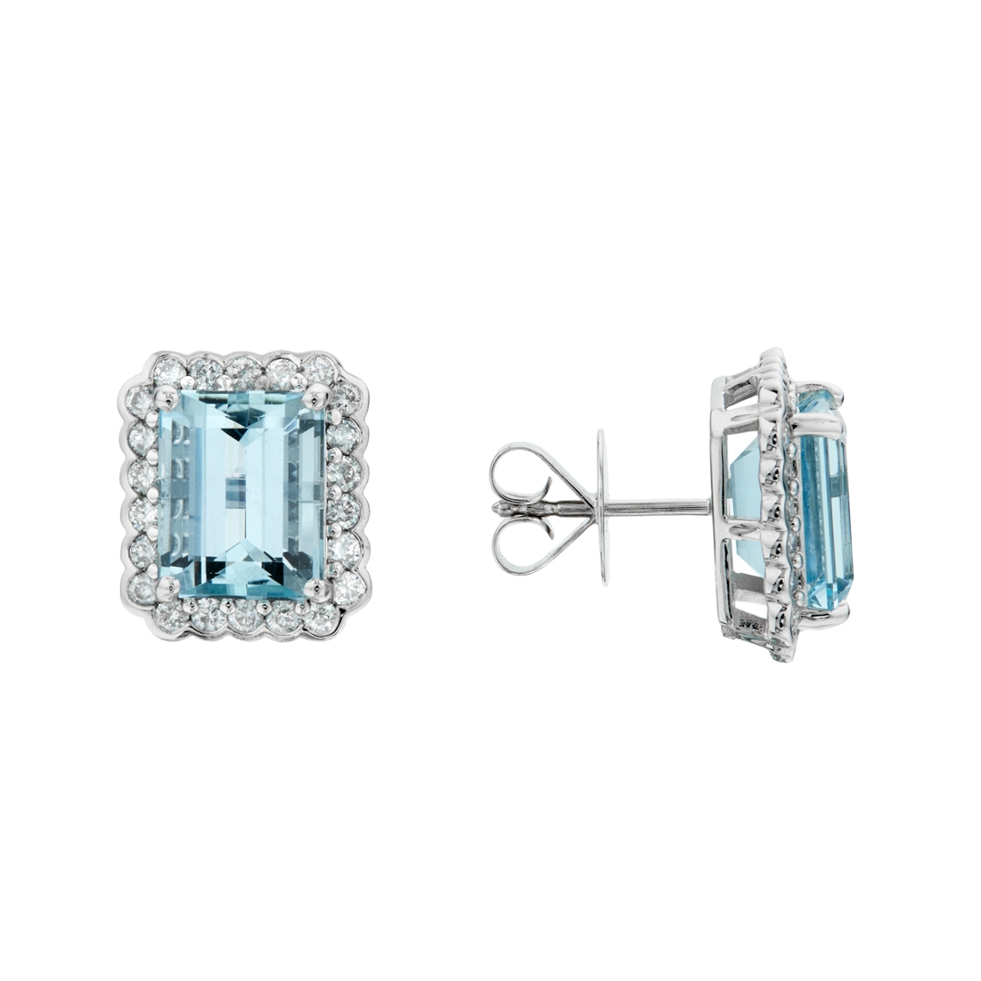 A brand-new, unused certified pair of natural diamond and aquamarine cluster earrings that combine cool, elegant colour with refined brilliance in a beautifully structured design. Each earring features an emerald-cut aquamarine, totalling an impressive 6.88ct, displaying a serene greenish-blue tone with crisp clarity that catches the light in long, glass-like flashes. The emerald cut enhances the gemstones’ natural sophistication, giving the earrings a clean, architectural profile that feels both modern and timeless when worn. Surrounding each aquamarine is a halo of natural brilliant-cut diamonds totalling 0.92ct in G–H colour and SI1 clarity, creating a bright, lively frame that elevates the aquamarines’ cool tones while adding a luxurious layer of sparkle.