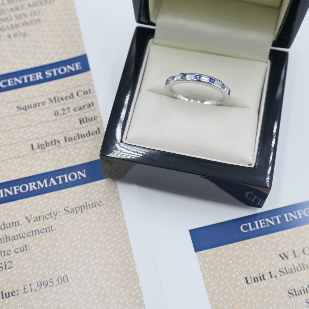 A brand-new, unused eternity ring crafted in certified platinum, this refined piece is set with seven square mixed-cut natural blue sapphires and six baguette-cut natural diamonds. The sapphires, weighing a total of 0.27ct, display a striking blue hue that symbolises depth and elegance, while the diamonds, weighing 0.33ct, are graded F–G in colour with SI1–SI2 clarity, offering crisp brilliance that contrasts beautifully against the richness of the sapphires. The combination of step-cut precision and smooth platinum gives the design a sleek and timeless character.
