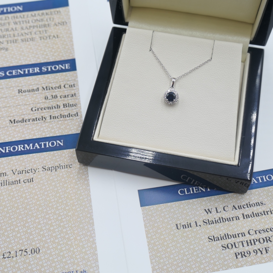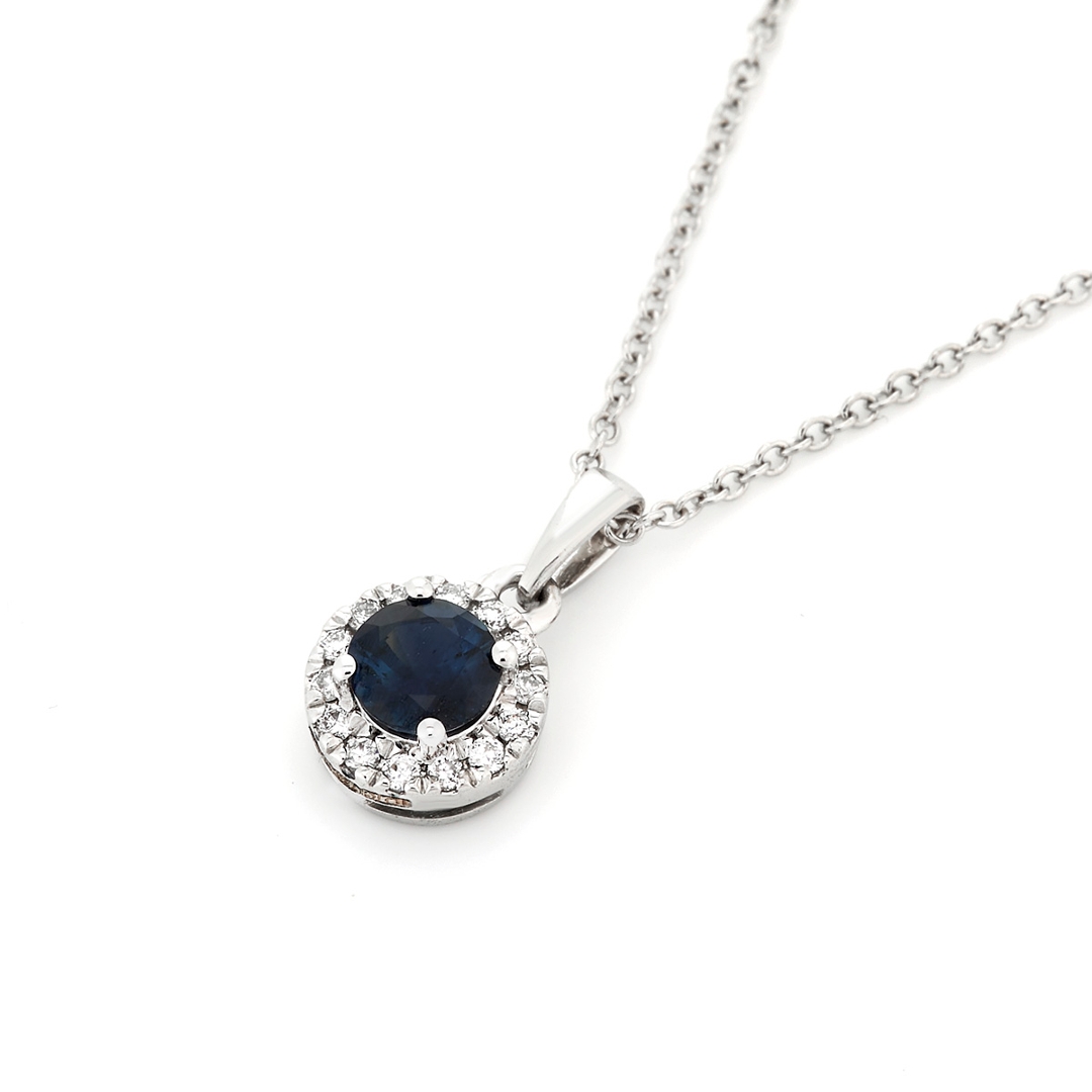 A brand new, unused certified natural diamond & blue sapphire gemstone round-shaped cluster pendant, with one round mixed cut blue sapphire gemstone to the centre & a cluster of brilliant cut diamonds in a halo setting, set in 18ct white gold.
