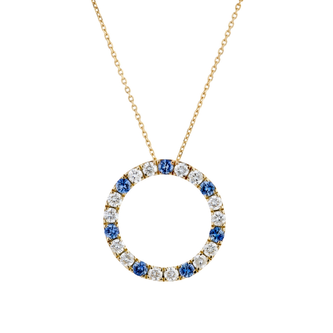 A brand-new, unused, certified natural diamond & blue sapphire circle-shaped cluster pendant, with seven round mixed-cut blue sapphire gemstones & fourteen brilliant-cut diamonds, in 9ct yellow gold.