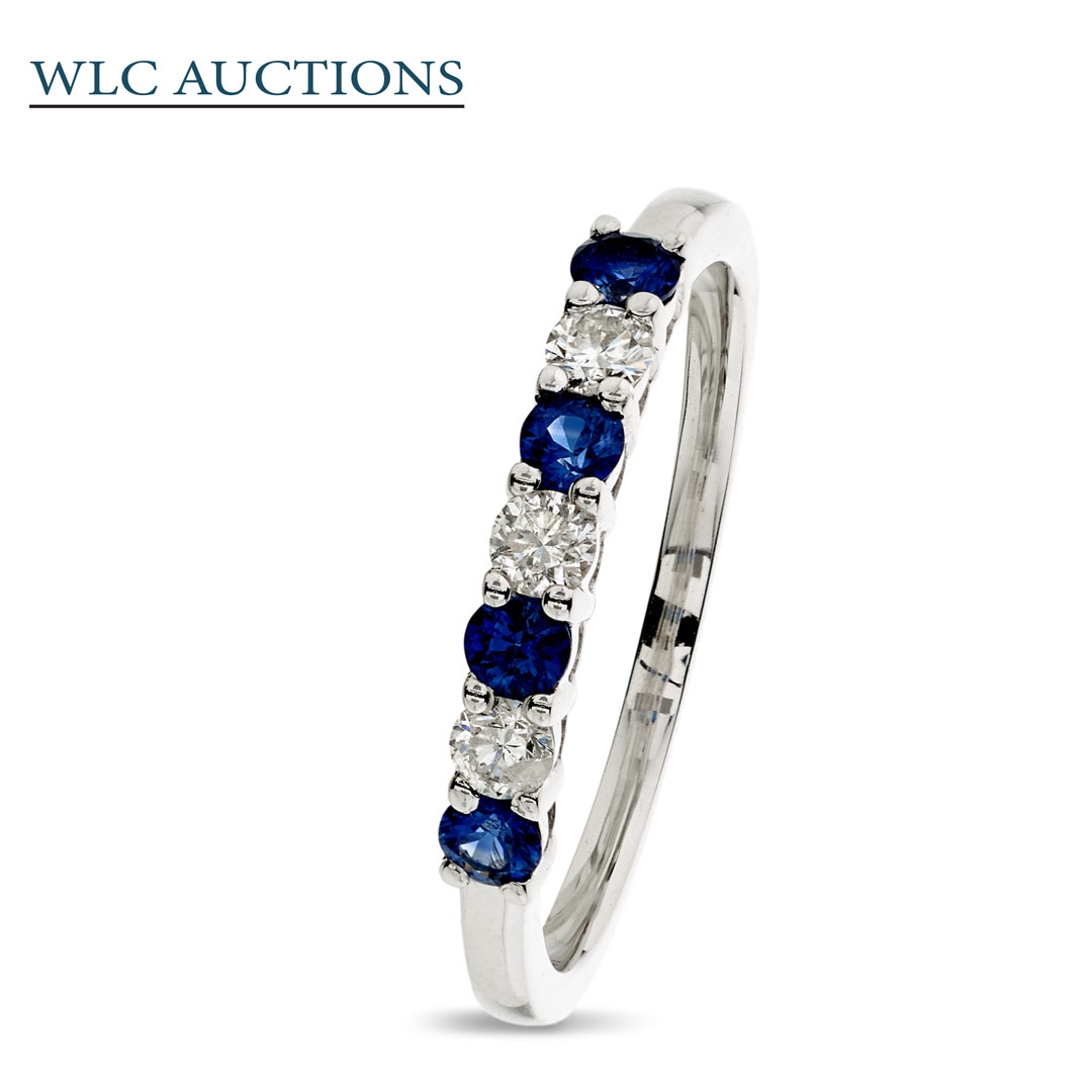 A brand new, unused, certified platinum natural diamond & blue sapphire gemstone eternity ring, set with four round mixed-cut blue sapphire gemstones & three brilliant-cut diamonds.