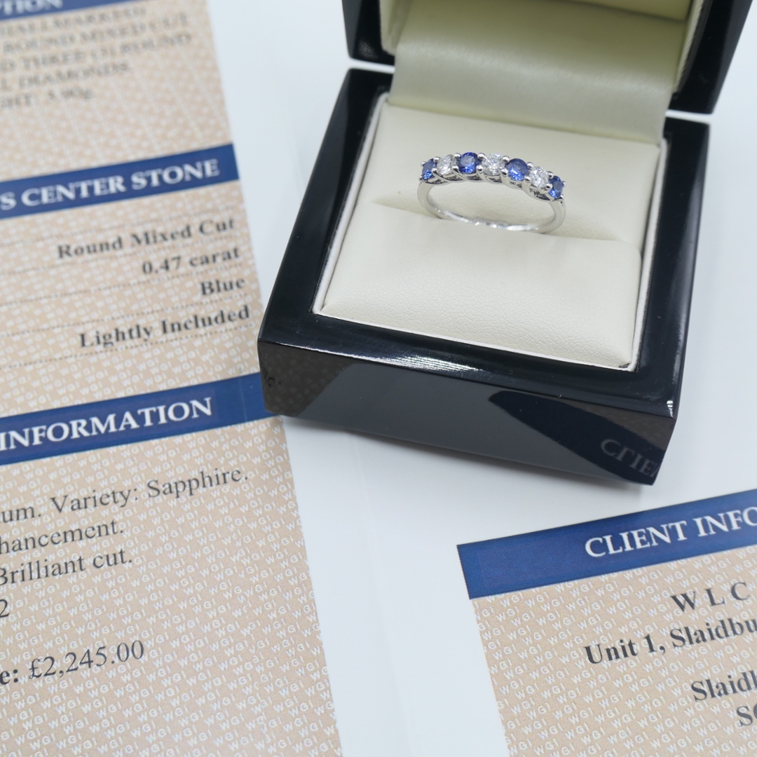 A brand new, unused, certified natural diamond & blue sapphire gemstone eternity ring, set with four round mixed-cut blue sapphire gemstones & three brilliant-cut diamonds, set in platinum.