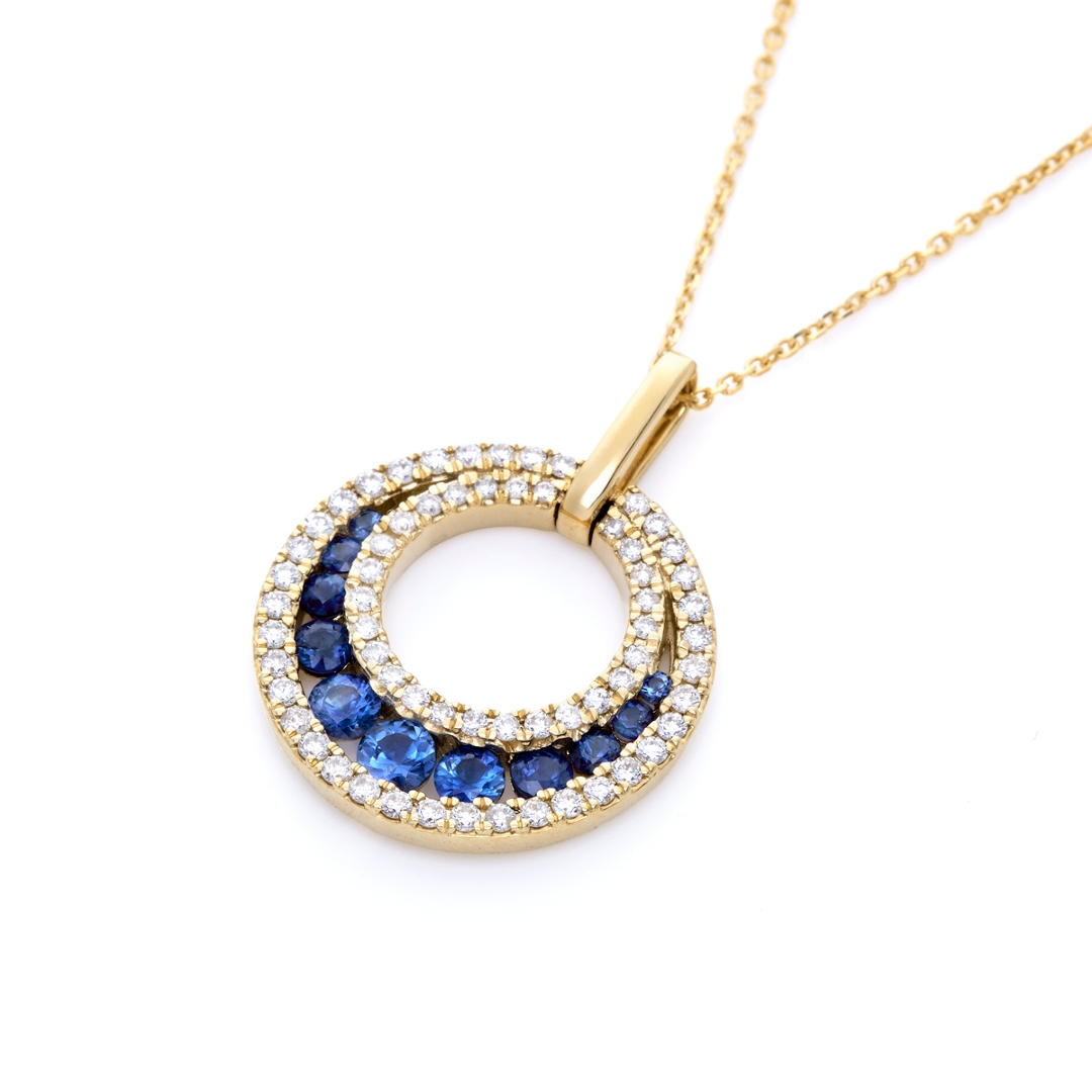 A brand-new, unused, certified natural diamond & blue sapphire circle-shaped cluster pendant, with a cluster of round mixed-cut blue sapphire gemstones at the centre & a cluster of brilliant-cut diamonds in a halo setting, in 9ct yellow gold.
