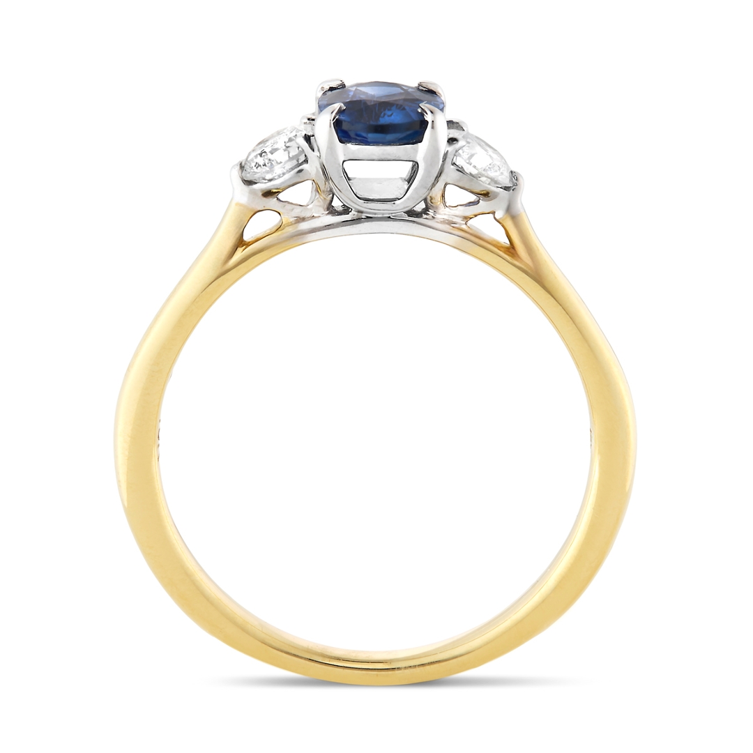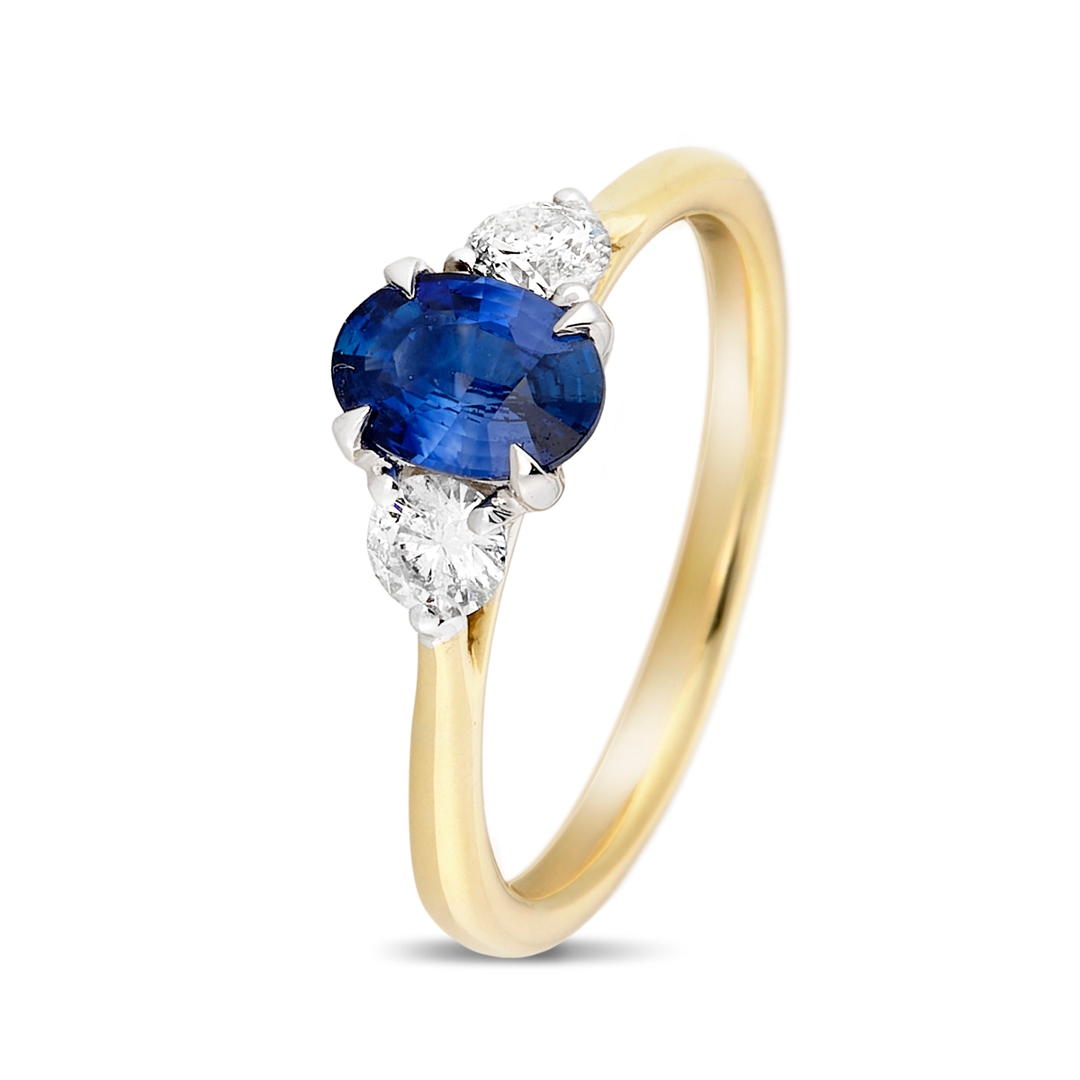 A brand-new, unused, certified natural diamond & blue sapphire gemstone three-stone cluster ring, set with one oval mixed-cut blue sapphire gemstone at the centre & two brilliant-cut diamonds to the sides, set in 18ct yellow & white gold.