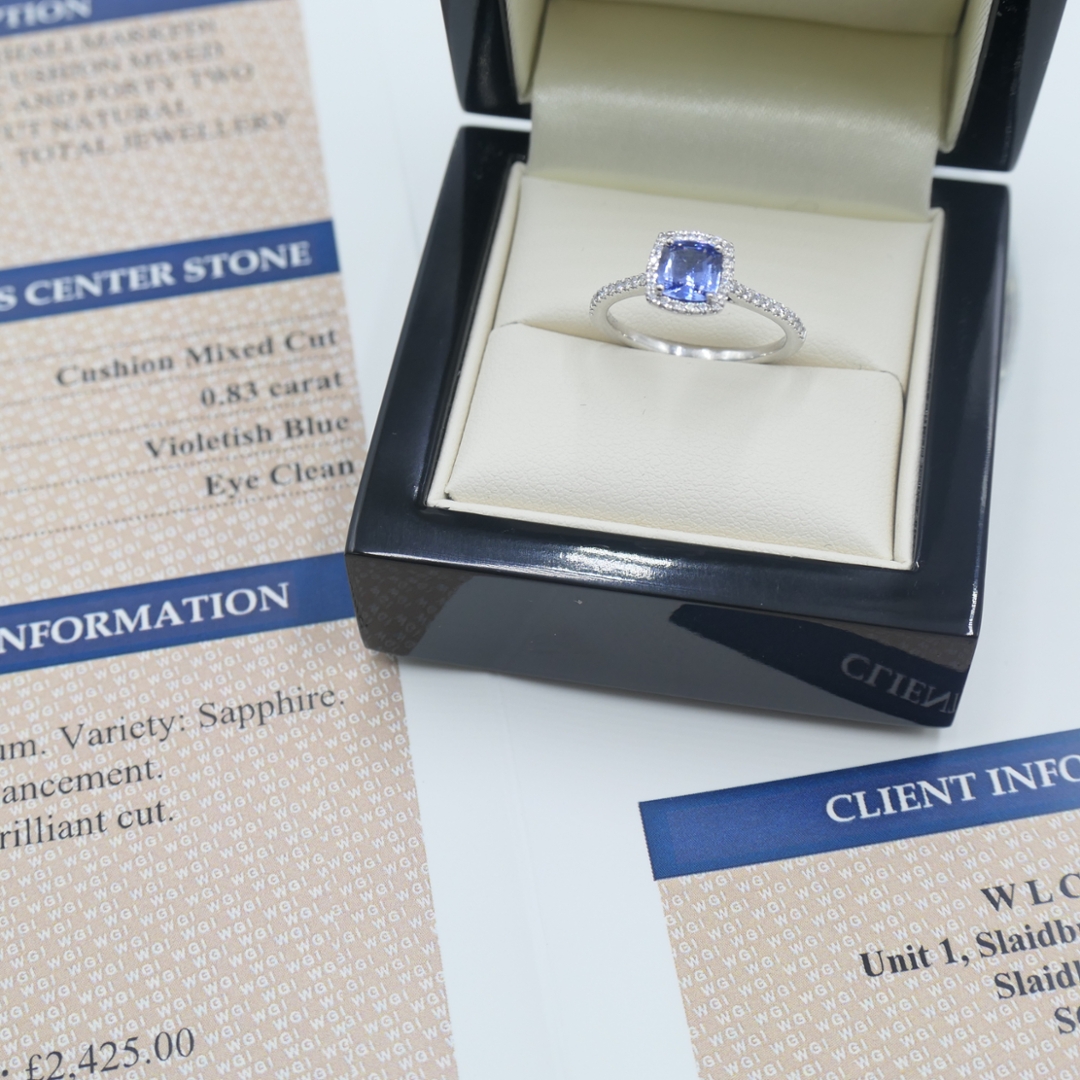 A brand-new, unused, certified natural diamond and blue sapphire cushion-shaped cluster ring that radiates timeless elegance and refined sophistication. At its centre is a captivating 0.83ct cushion-cut blue sapphire, displaying a rich violetish-blue hue that exudes depth, grace and allure. Surrounding the sapphire is a halo of brilliant-cut natural diamonds, with additional diamonds extending along the shoulders, totalling 0.20ct. The diamonds, graded G–H in colour and SI1–SI2 in clarity, add a mesmerising sparkle that beautifully complements the sapphire’s vivid tone. Expertly crafted in platinum, a metal renowned for its purity, strength and enduring lustre, this ring showcases exceptional craftsmanship and contemporary refinement. With a total weight of 4.09 grams and a professional valuation of £2,425, it represents a perfect union of quality and beauty.