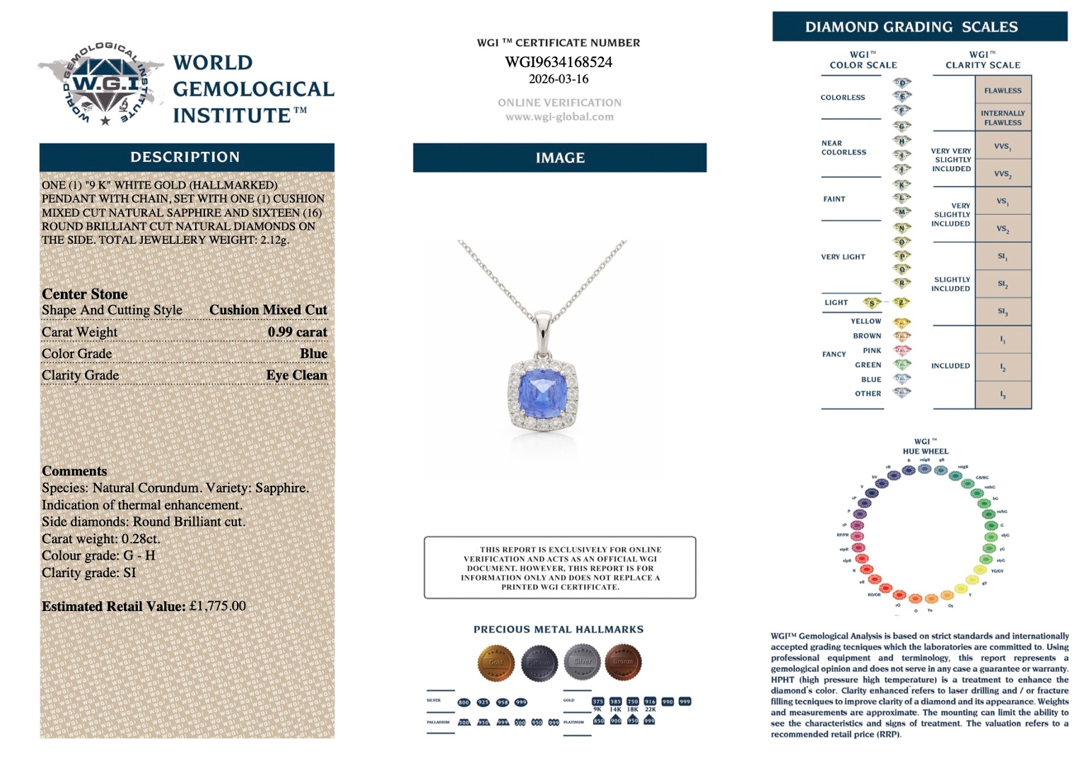 A brand-new, unused, certified natural diamond & blue sapphire cushion-shaped cluster pendant, with one cushion mixed-cut blue sapphire gemstone at the centre & a cluster of brilliant-cut diamonds in a halo setting, in 9ct white gold.
