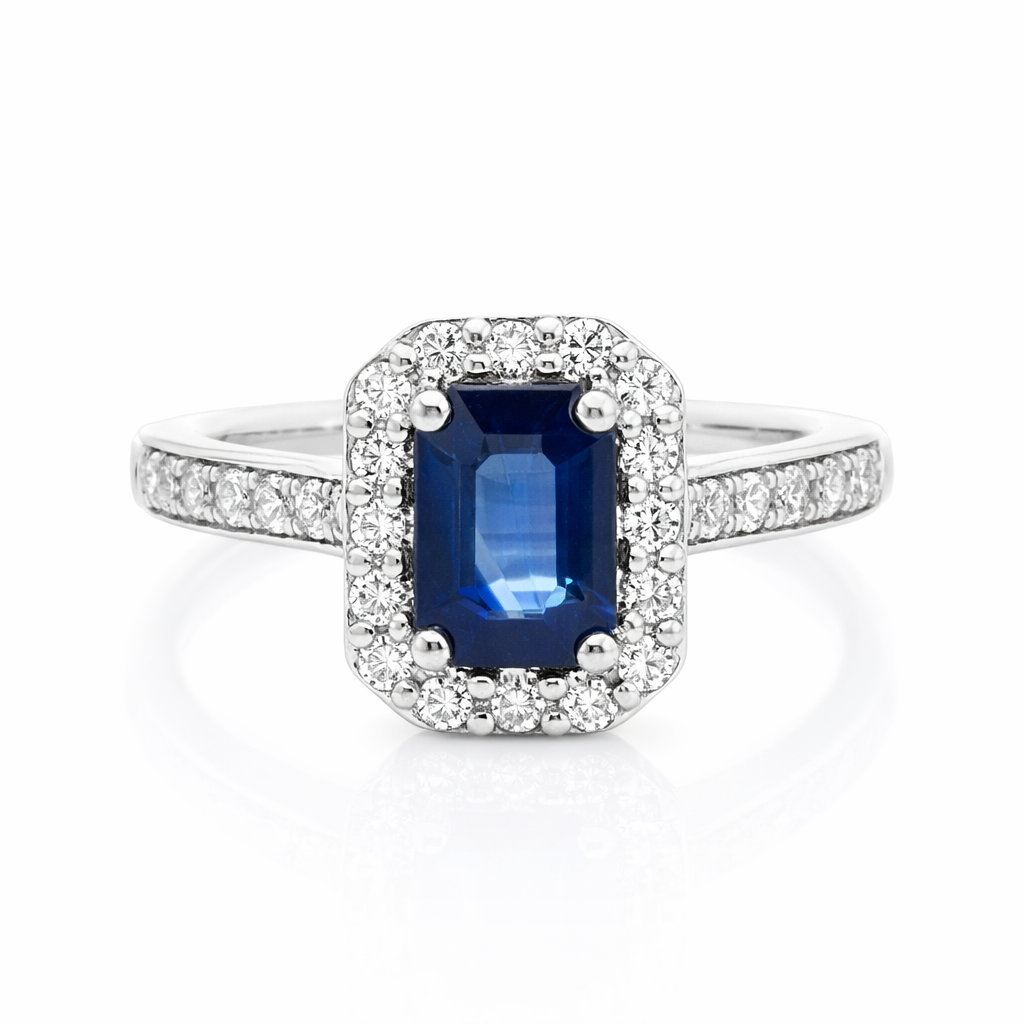 Natural Blue Sapphire 0.99ct & Diamond 0.38ct Asscher Shaped Cluster Ring