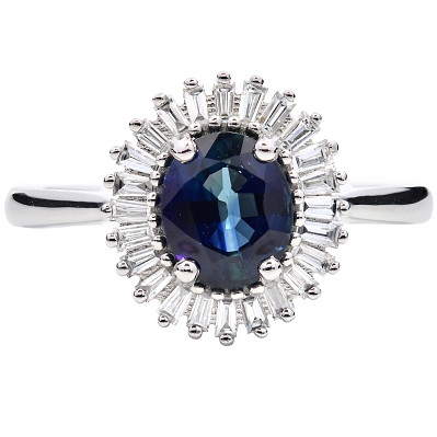A brand-new, unused, certified natural diamond & blue sapphire gemstone cluster ring, set with one oval-cut blue sapphire gemstone at the centre & a cluster of baguette-cut diamonds in a halo setting, set in platinum.