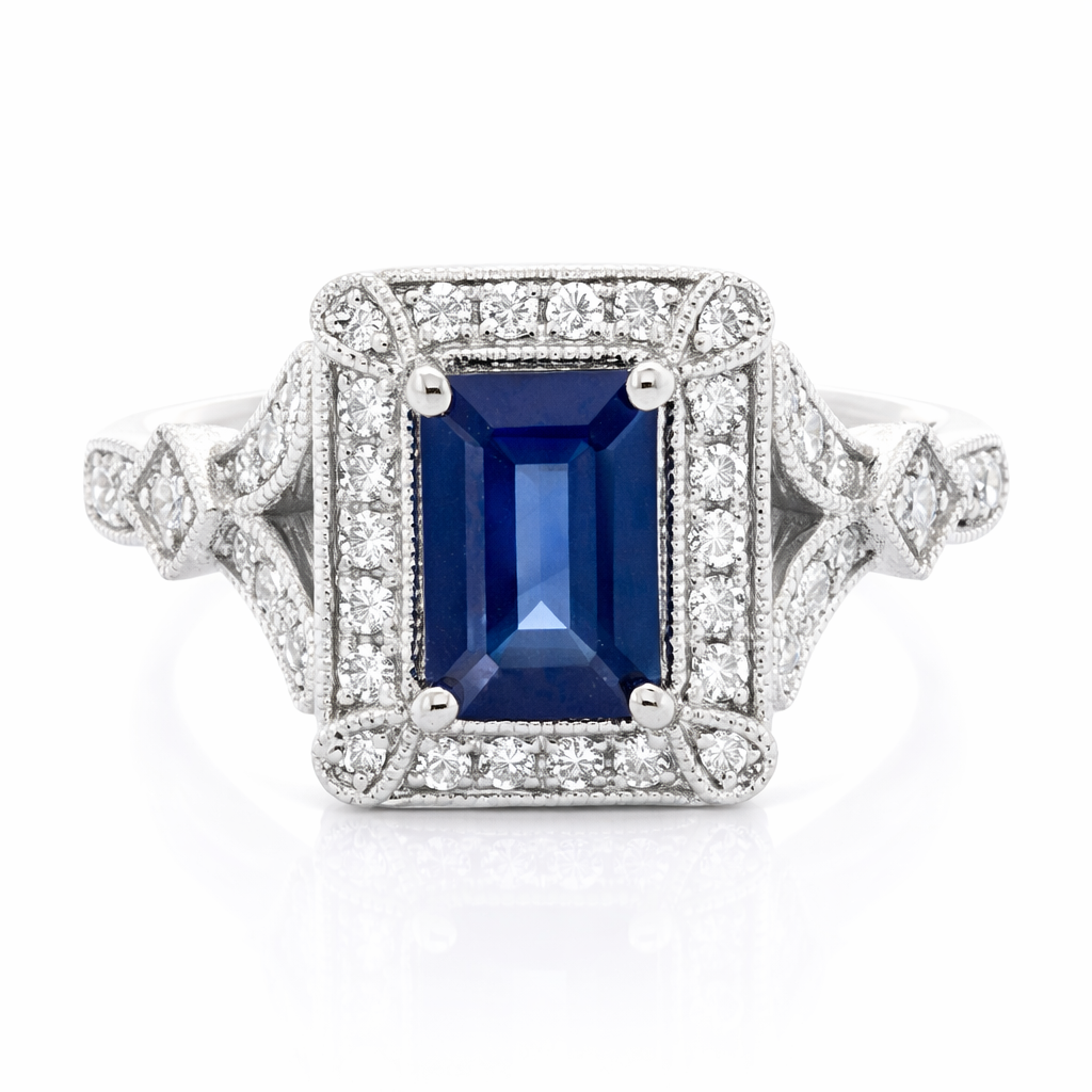 A brand-new, unused certified natural diamond and blue sapphire cluster ring, expertly crafted in platinum and designed to showcase the timeless pairing of vivid colour and radiant brilliance. At its centre sits an emerald-cut blue sapphire weighing 1.07 carats, displaying the rich royal blue tone that has long made sapphire one of the most admired gemstones in fine jewellery. The elegant emerald cut highlights the stone’s natural clarity and depth of colour, allowing the sapphire to present itself with refined confidence.