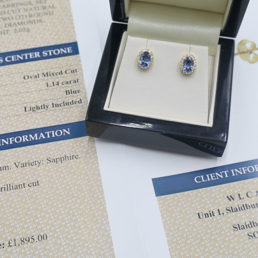 A brand-new, unused certified pair of 18ct yellow gold diamond and blue sapphire oval-shaped cluster earrings designed to exude classic elegance and refined luxury. At the heart of each earring sits a stunning, mixed-cut blue sapphire, weighing a total of 1.14 carats. These deep blue gemstones, long associated with wisdom and royalty, shimmer beautifully against the warm glow of the yellow-gold setting. Their rich hue is further accentuated by a halo of brilliant-cut diamonds, meticulously arranged to enhance their brilliance and create an enchanting play of light with every movement.