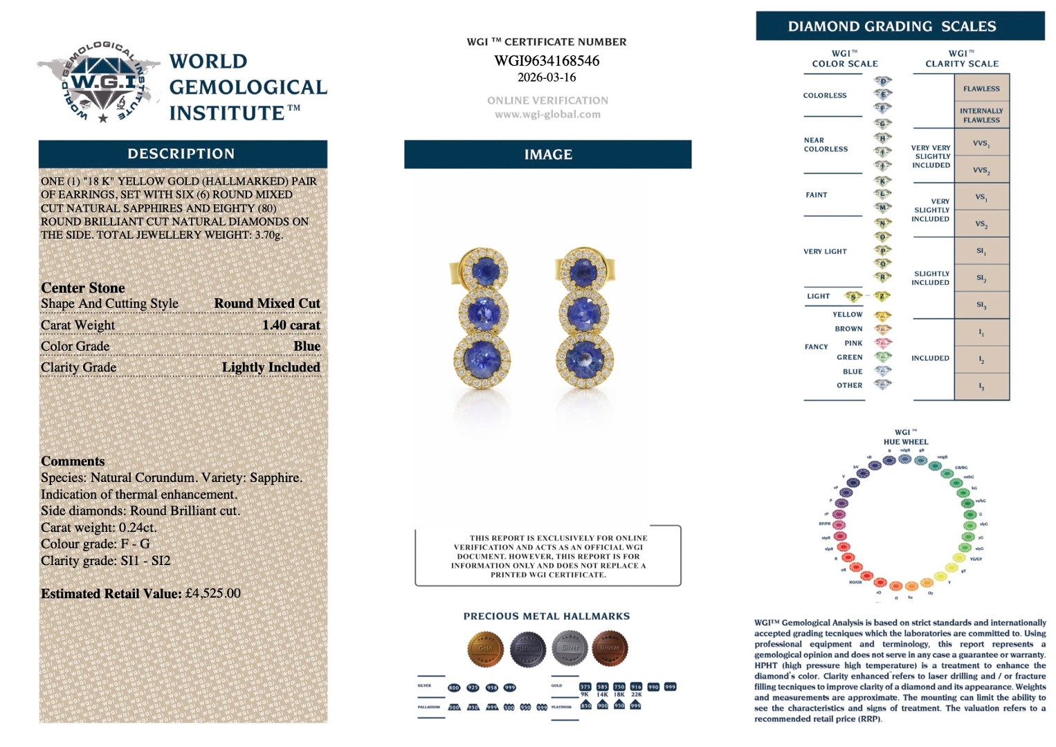 The blue sapphires have a combined weight of 1.40ct, displaying a deep and vibrant colour, while the surrounding natural diamonds total 0.24ct, graded F–G in colour and SI1–SI2 in clarity. Natural diamonds continue to be highly appreciated for their rarity and sustained global demand, reinforcing their status as a valuable and enduring feature within fine jewellery.