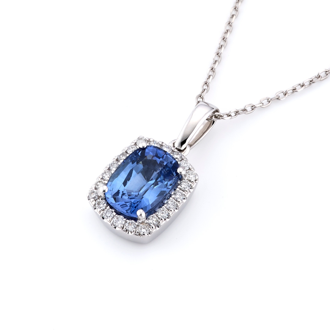 A brand new, unused certified natural diamond and blue sapphire cushion-shaped cluster pendant that exudes sophistication, luxury and timeless charm. At its centre is a captivating 1.60ct cushion-cut blue sapphire, displaying a rich violetish-blue hue that symbolises wisdom, serenity and refined beauty. Surrounding the sapphire is a halo of brilliant-cut natural diamonds, totalling 0.14ct, graded G–H in colour and SI1–SI2 in clarity. The diamonds’ radiant sparkle beautifully enhances the sapphire’s deep tone, creating an elegant contrast of light and colour. Crafted in luminous 18ct white gold, the cool sheen of the metal accentuates the gemstones’ brilliance, giving the pendant a graceful and enduring appeal. With a total weight of 3.01 grams and a professional valuation of £4,125, this piece is a testament to fine craftsmanship and classic design.