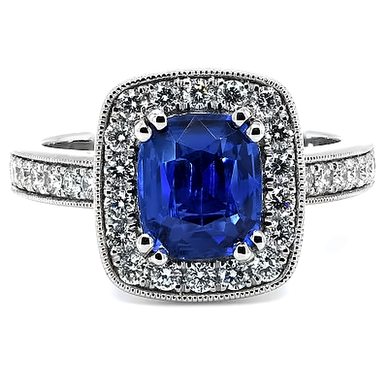 - > Natural Blue Sapphire 1.60ct & Diamond 0.51ct Cushion Shaped Cluster Ring