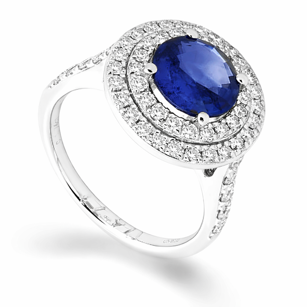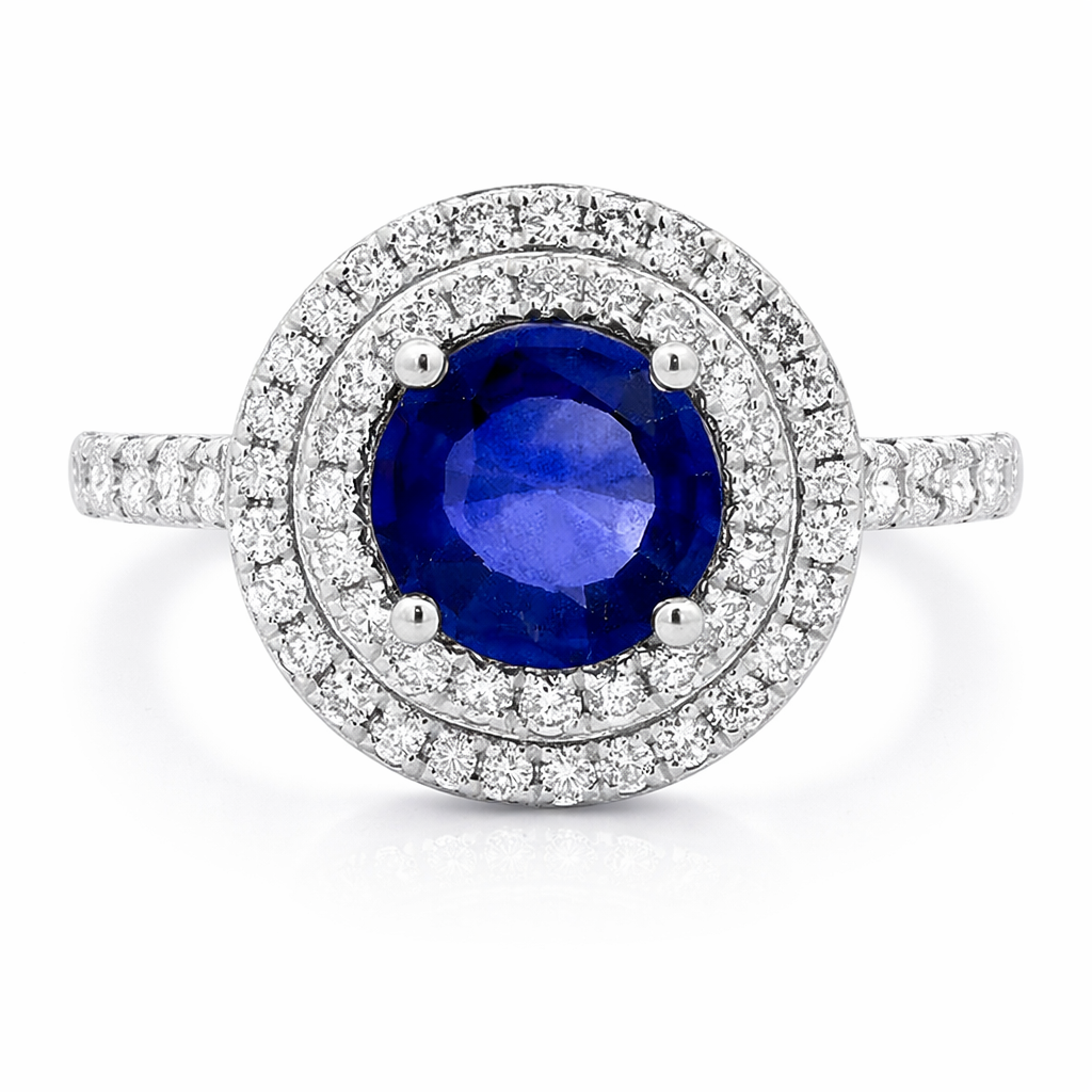 A brand-new, unused, certified natural diamond and blue sapphire round-shaped cluster ring, centred with a striking 1.74ct round-cut blue sapphire of exceptional depth and vibrancy. The sapphire’s rich blue tone is beautifully proportioned, offering impressive presence and remarkable clarity. It is encircled by a double halo of brilliant-cut natural diamonds, carefully arranged to create a bold, layered frame that enhances the overall size and visual impact of the centre stone.