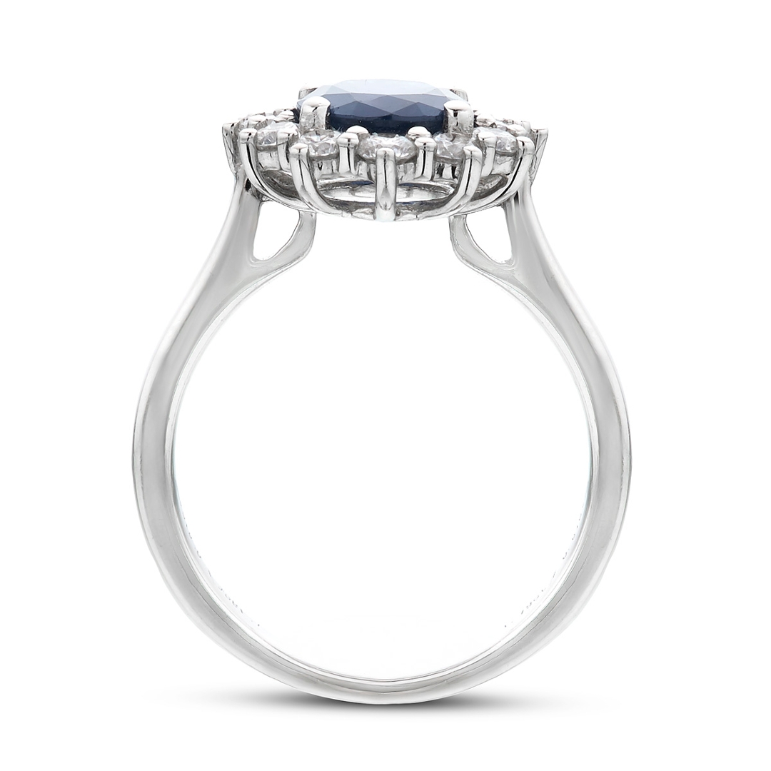A brand-new, unused, certified natural diamond & blue sapphire gemstone cluster ring, with one oval mixed-cut blue sapphire gemstone to the centre & a cluster of brilliant cut diamonds in a halo setting, set in platinum.