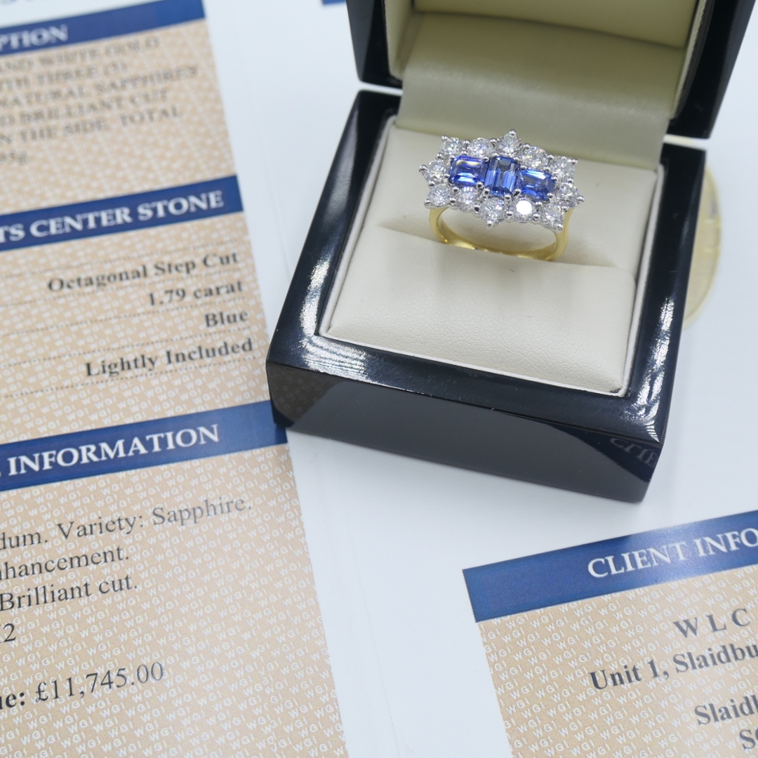 A brand-new, unused cluster ring crafted in certified 18ct yellow and white gold, this remarkable design features three octagonal step-cut natural blue sapphires weighing a combined 1.79ct. Their vivid blue tones are enhanced by a halo of twelve brilliant-cut natural diamonds, totalling an impressive 2.52ct. The dual tones of gold provide both warmth and elegance, with the sapphires offering depth of colour while the diamonds surround them with dazzling radiance. The combination of refined craftsmanship and striking gemstones makes this ring a statement piece of both style and distinction.