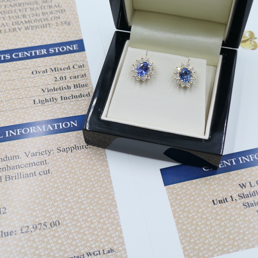 Natural diamonds are revered for their rarity, purity, and everlasting brilliance—qualities that make them a cornerstone of fine jewellery and a symbol of enduring value. Their intrinsic worth and timeless appeal ensure they remain a wise and elegant investment, appreciated by collectors and enthusiasts alike. With a total weight of 2.58 grams and an insurance valuation of £2,975.00, this certified pair of earrings exemplifies exceptional craftsmanship and refined design. A true expression of prestige and beauty, these earrings unite the regal allure of blue sapphires with the timeless sparkle of natural diamonds, crafted to be treasured for generations.