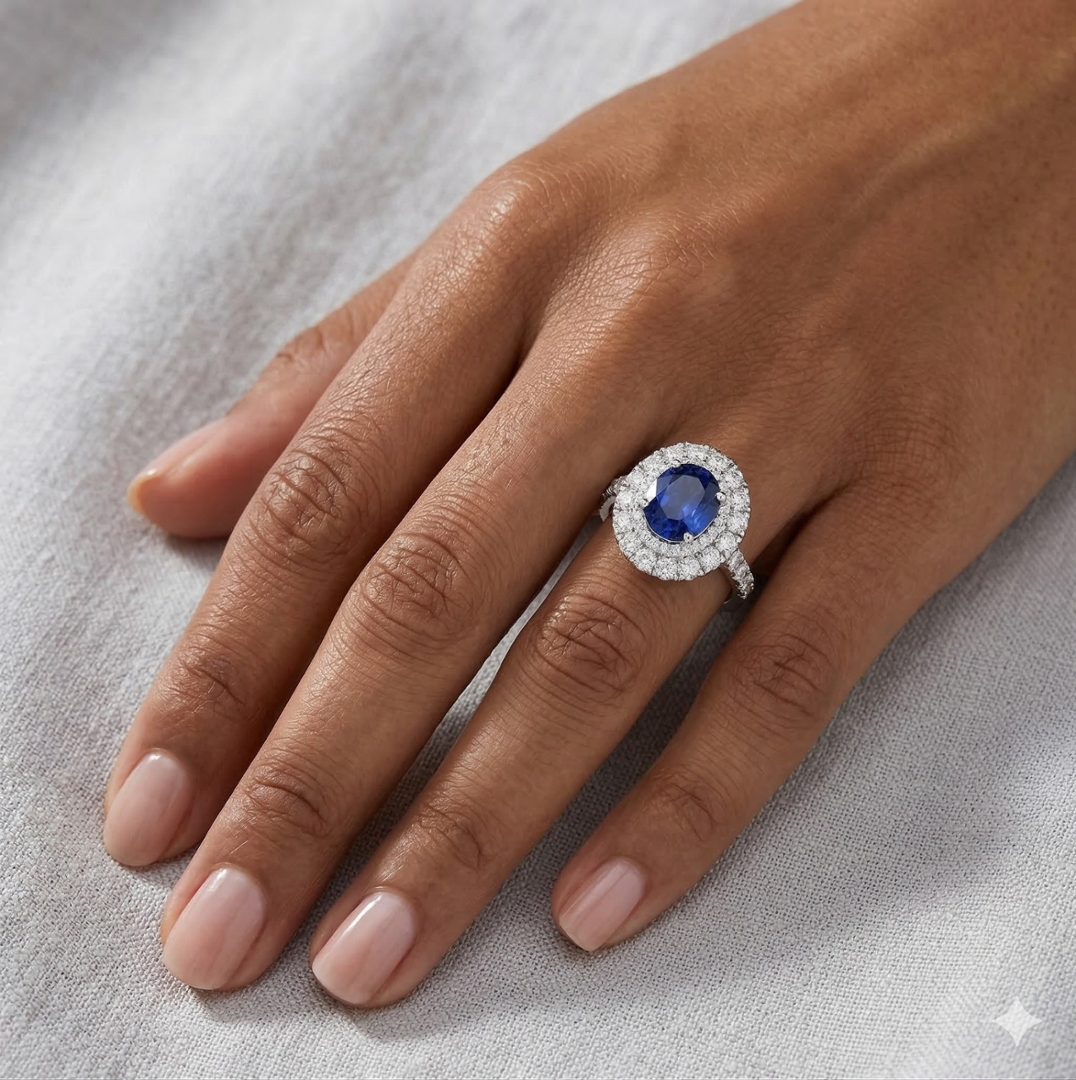 A brand-new, unused, certified natural diamond and blue sapphire oval-shaped cluster ring, centred with a magnificent 2.14ct oval-cut blue sapphire showcasing rich, velvety blue saturation and excellent natural clarity. The elongated oval cut enhances the gemstone’s depth of colour while creating an elegant, flattering presence on the hand. Framing the centre stone is a striking double halo of brilliant-cut natural diamonds that extends seamlessly to the shoulders, bringing the total diamond weight to an impressive 1.19ct and delivering exceptional sparkle from every angle.