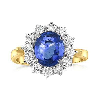 A brand-new, unused, certified natural diamond & blue sapphire cluster ring, with one oval-cut blue sapphire gemstone at the centre & a cluster of brilliant-cut diamonds in a halo setting, set in 18ct white & yellow gold.