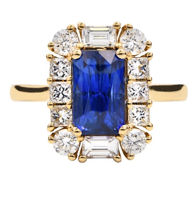 A brand-new, unused, certified natural diamond & blue sapphire emerald-shaped cluster ring, set with one radiant-cut blue sapphire gemstone at the centre & a cluster of princess-cut, baguette-cut & brilliant-cut diamonds in a halo setting, set in 18ct yellow gold.