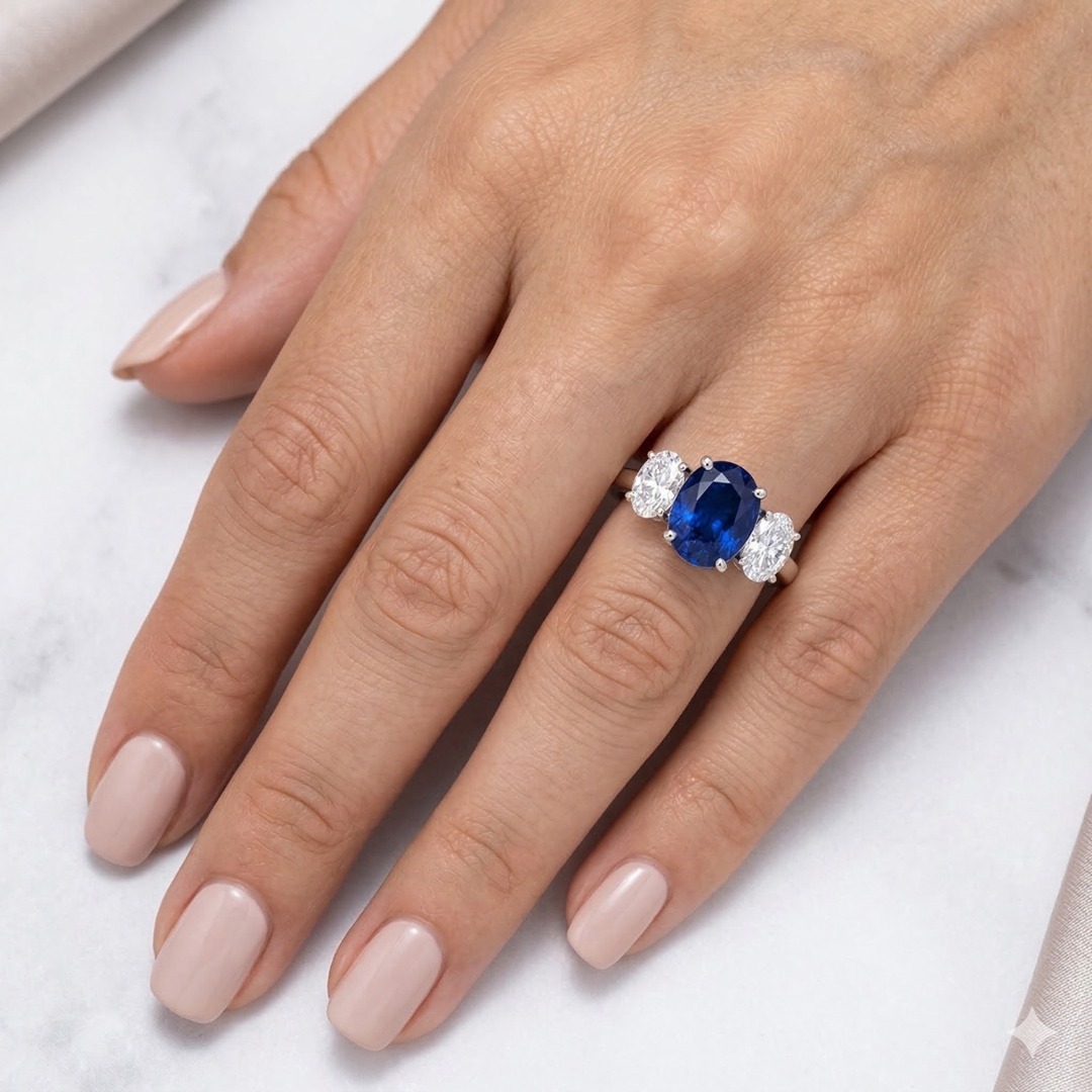 A brand-new, unused, certified natural diamond and blue sapphire three-stone cluster ring, crafted in platinum and presented in immaculate condition. At the centre sits an oval-cut blue sapphire weighing 3.61 carats, selected for its strong saturation, depth of colour, and elegant elongated profile. Flanking the sapphire are two oval-cut natural diamonds with a combined weight of 0.92 carats, chosen to mirror the centre stone’s shape while adding balance, brightness, and refined symmetry across the finger.