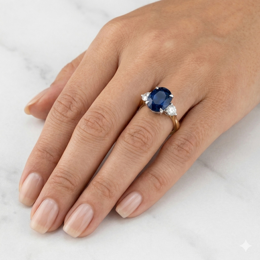 A brand-new, unused, certified 18ct yellow and white gold natural diamond and blue sapphire three-stone cluster ring, this exquisite piece features a 3.17ct oval mixed-cut blue sapphire at the centre, with its deep, dark blue hue making a bold, captivating statement. On either side of the sapphire sit two brilliant-cut diamonds, totalling 0.34ct, graded SI1-SI2 for clarity and G-H for colour, adding exceptional brilliance and enhancing the sapphire's striking colour. The contrast between the rich sapphire and the sparkling diamonds creates a harmonious, visually striking effect.
