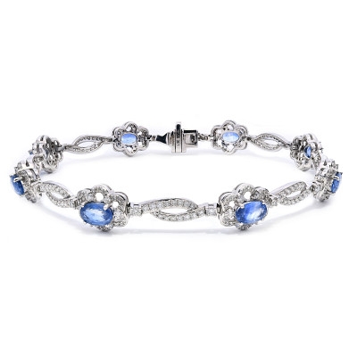 A brand-new, unused, certified natural diamond and blue sapphire flower-shaped cluster bracelet, crafted in 18ct white gold and presented in pristine condition. The centre of the bracelet is formed by a series of floral-inspired clusters, each set with oval-cut blue sapphires, totalling 4.63 carats. The sapphires are selected for their rich blue tone and natural depth, arranged to create a flowing, elegant composition across the wrist. Interspersed throughout are brilliant-cut natural diamonds totalling 2.07 carats, adding contrast, definition, and refined brilliance without overpowering the sapphires.